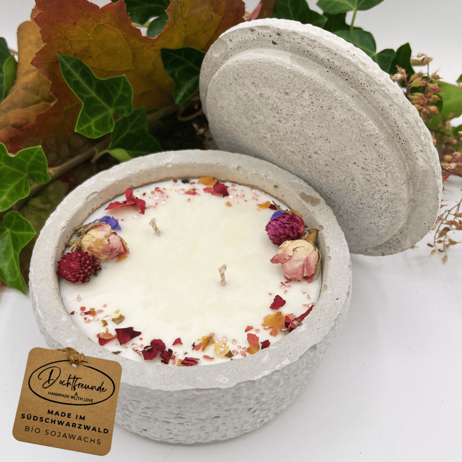 Schützen Sie die Kerze vor direkten Wettereinflüssen, um ihre Qualität zu erhalten, insbesondere bei Outdoor-Nutzung. Produktdetails Material: Veganes Sojawachs, versiegelter Beton, Baumwolldocht, getrocknete Blüten Gewicht: Ca. >0,75 kg inkl. Deckel / Endgewicht mit Wachs >1,00 kg