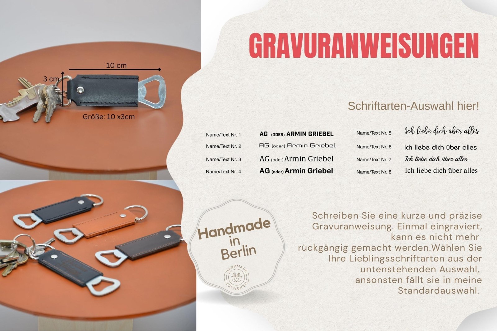 Platzierung der Gravur: Standardmäßig wird die Gravur auf der Vorderseite des Schlüsselanhängers platziert, nahe dem Flaschenöffner.