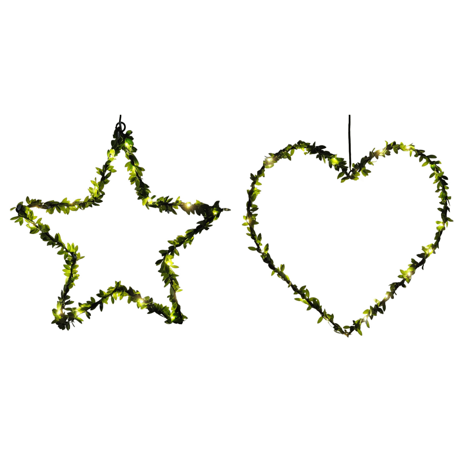 Herz oder Stern Fenster LED Silhouette Batteriebetrieben in warmweiß mit grünen Kunststoff Blättern geschmückt.