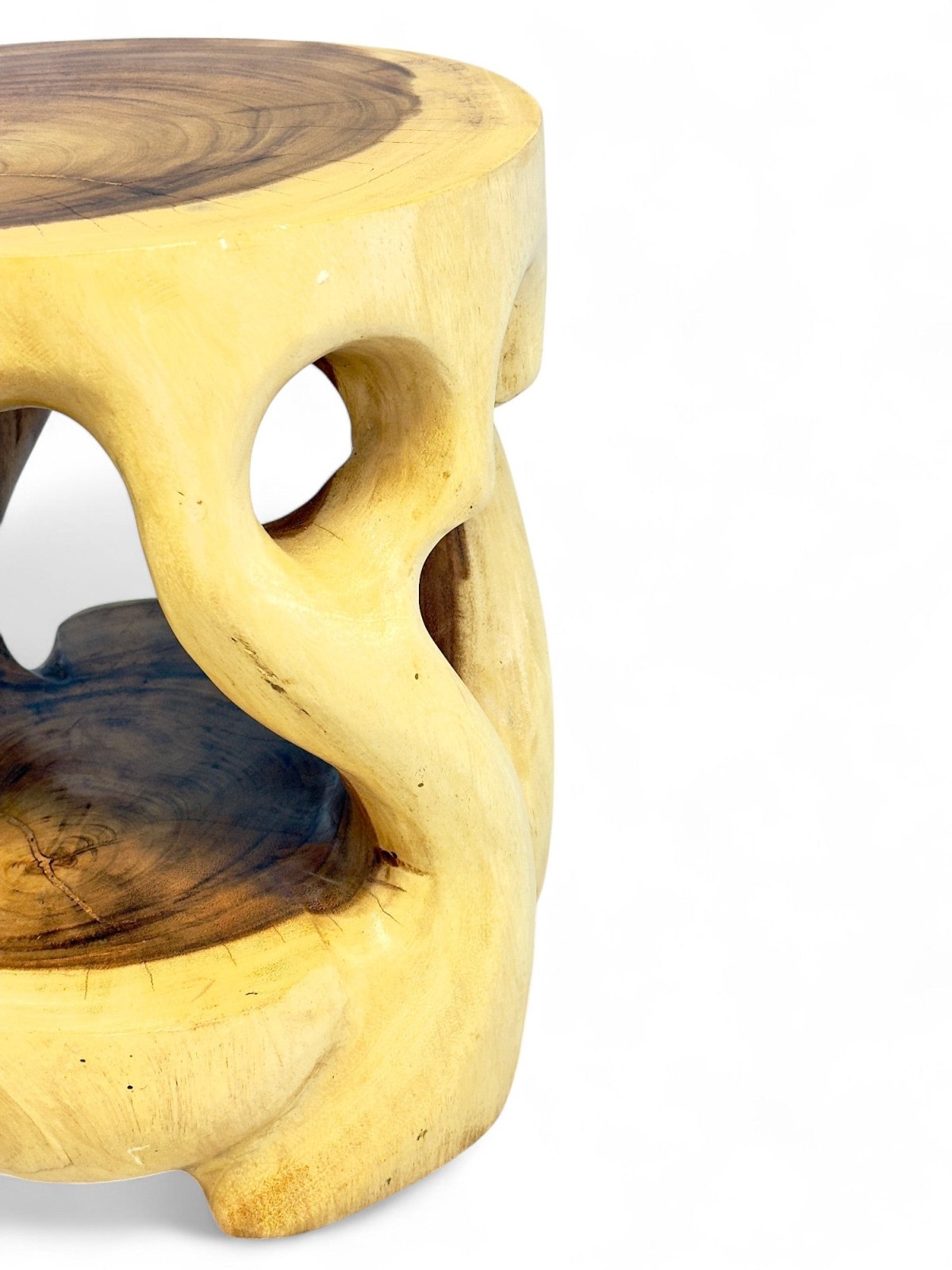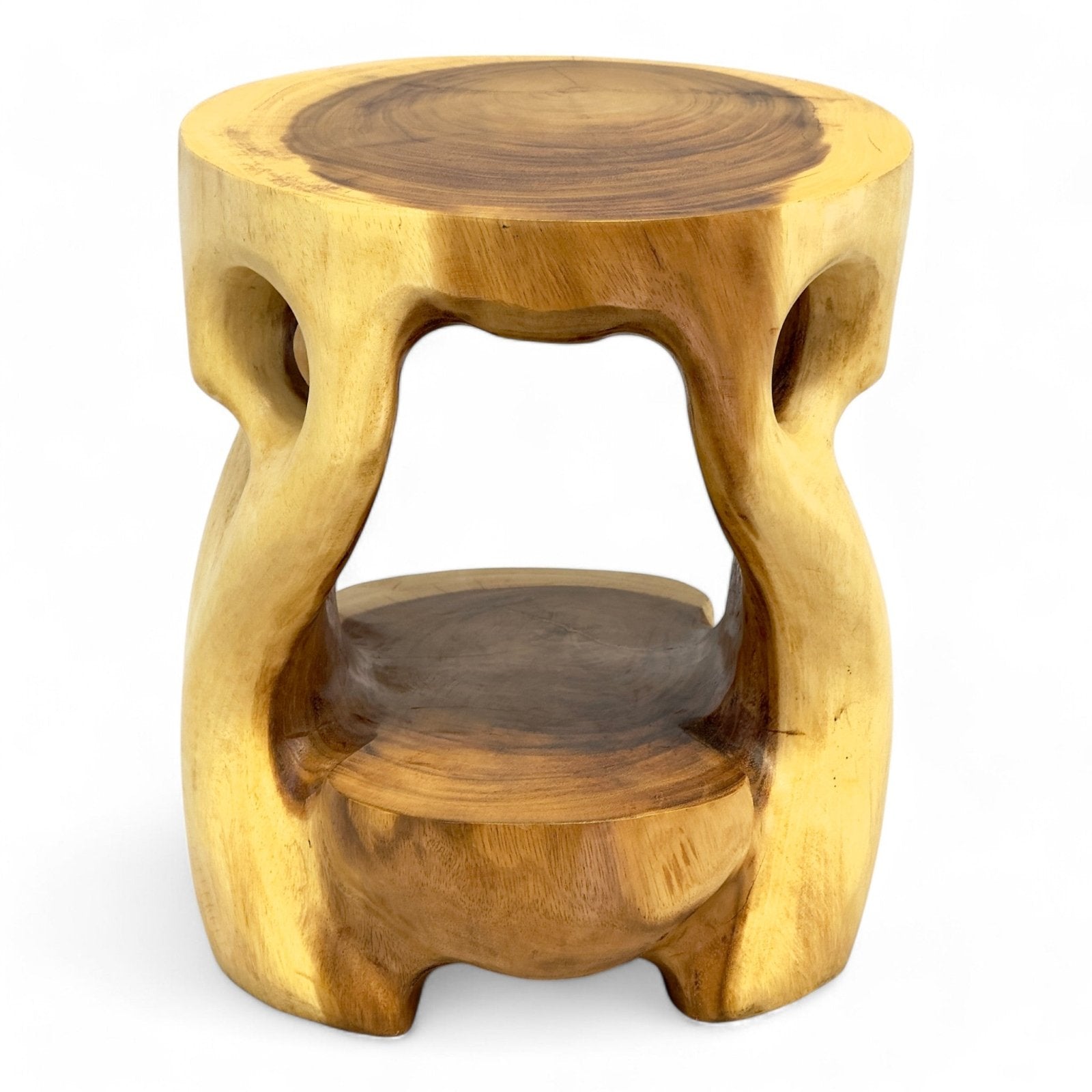 Dieser runde Beistelltisch aus massivem Teakholz besticht durch seine einzigartige, organische Form, die wie aus einem Stück gefertigt wirkt. Die geschwungenen Aussparungen und natürlichen Konturen verleihen dem Tisch eine moderne und zugleich naturverbundene Optik. Die wunderschön sichtbare Holzmaserung unterstreicht den rustikalen Charme und macht jedes Stück zu einem Unikat.
