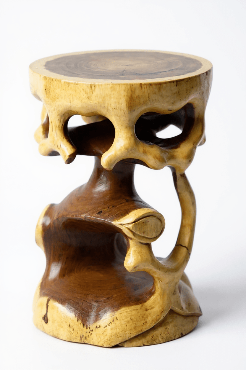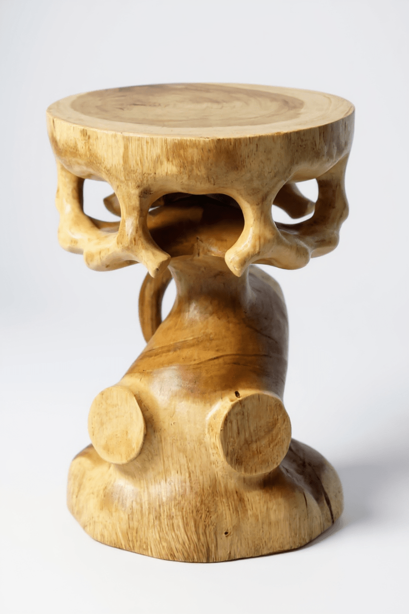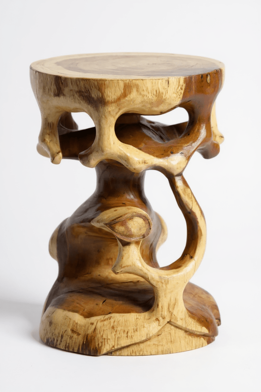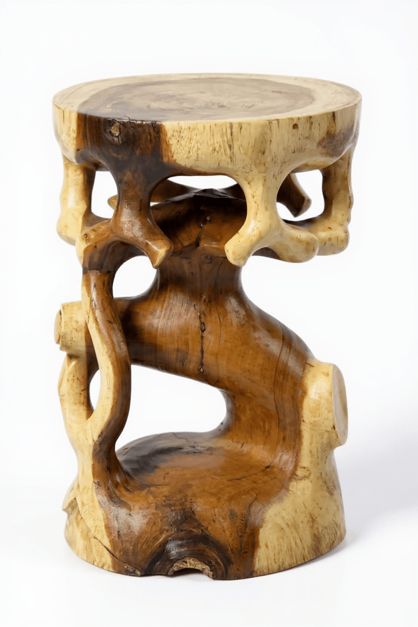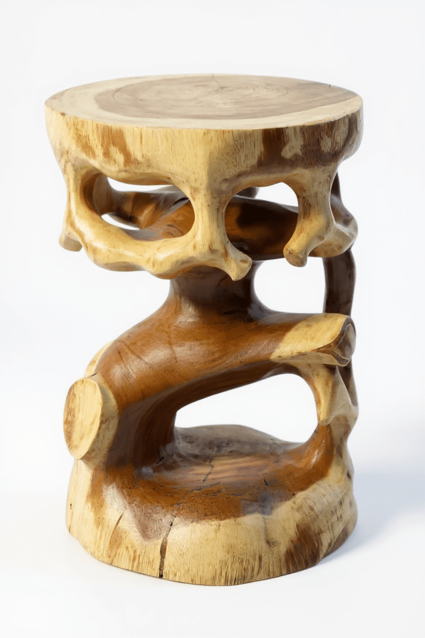 Geschwungenes Design: Der Saman Holzhocker beeindruckt mit einem kunstvollen, geschwungenen Design, das durch Handarbeit aus einem einzigen Holzblock entstanden ist.