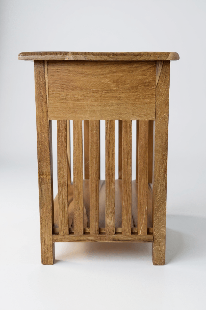 Unterhalb der Schublade finden Sie ein offenes Fach, ideal zur Aufbewahrung von größeren Gegenständen wie Bücher, Tablets oder anderen Utensilien, die Sie in Griffweite haben möchten.