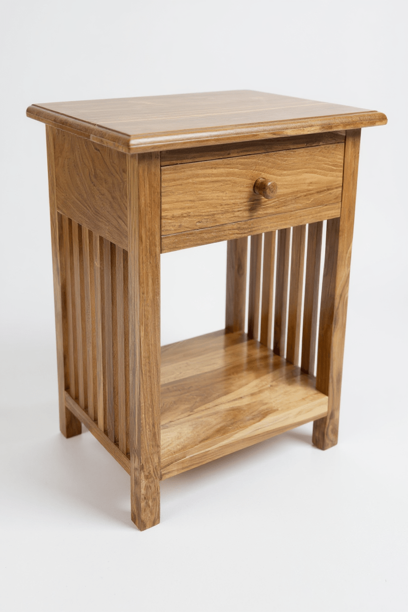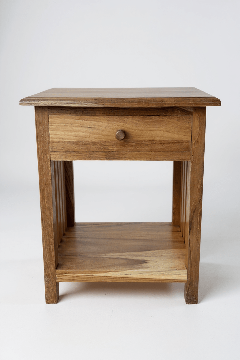Unser Nachttisch besteht aus hochwertigem Teakholz, das für seine Robustheit und Langlebigkeit bekannt ist. Das Design ist schlicht und elegant, mit klaren Linien, die dem Stück einen modernen Vintage-Look verleihen. Die natürliche Maserung des Teakholzes verleiht jedem Nachttisch seinen eigenen einzigartigen Charme. Jeder Nachttisch ist ein handgefertigtes Unikat, was ihm eine besondere Note und individuellen Charakter verleiht.