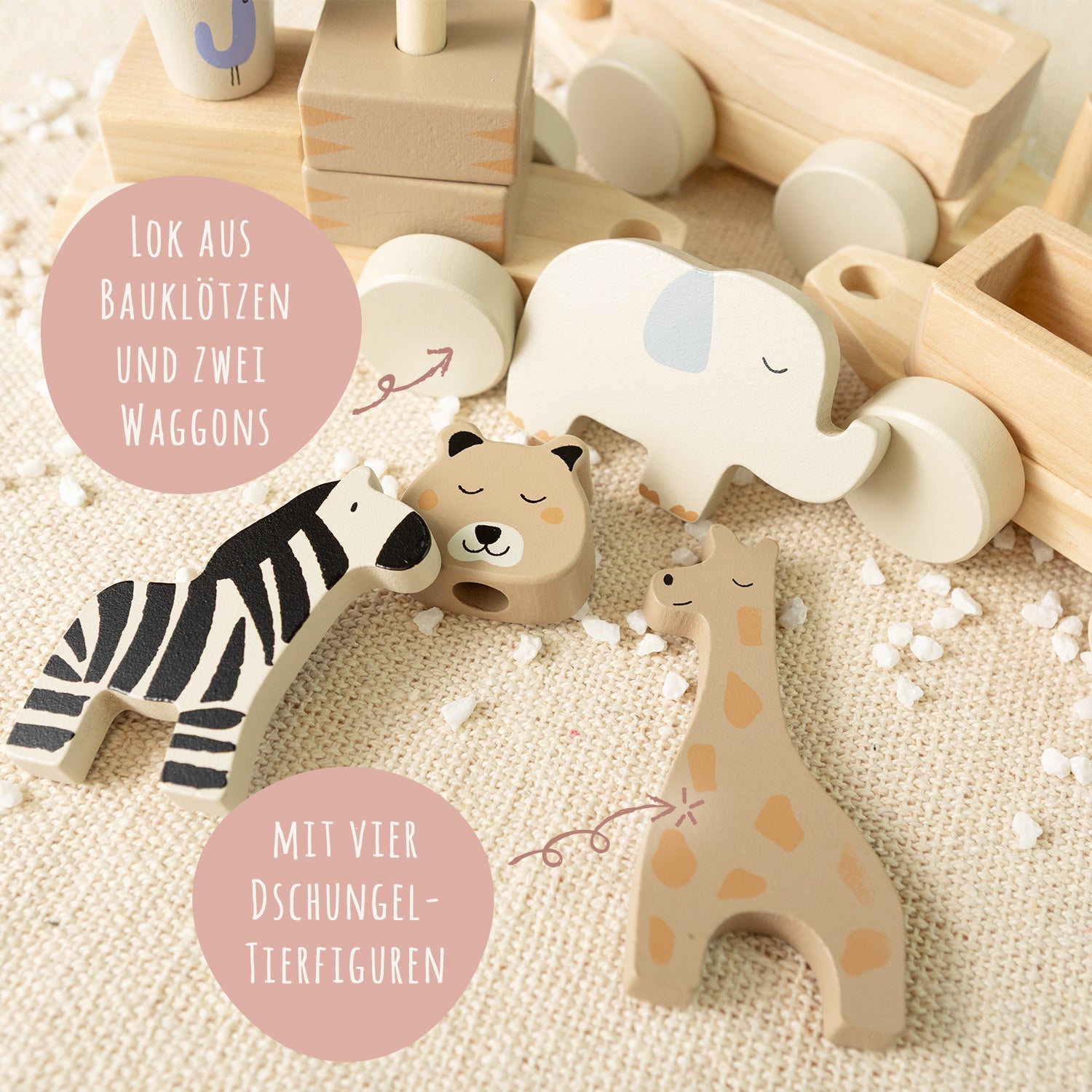 Die Holzeisenbahn im Dschungel-Design ist ein zeitloser Spielzeugklassiker. Mit Krokodil, Giraffe, Elefant, Zebra und Gepard fahren kleine Entdecker ihre tierischen Freunde sicher durch das Kinderzimmer und üben dabei spielerisch Motorik, Koordination und Fantasie. Viele Stunden Spielspaß voller abwechslungsreicher Abenteuer garantiert.