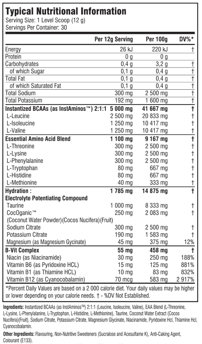 Mehr als nur einfache BCAAs – HYDRA CHARGE kombiniert die InstAminos™-Technologie mit hochwertigen Elektrolyten und B-Vitaminen und ist damit die ultimative Waffe gegen Dehydration und Muskelabbau. Mit 5.000 mg InstAminos™ BCAAs pro Portion sind Ihre Muskeln rundum geschützt.