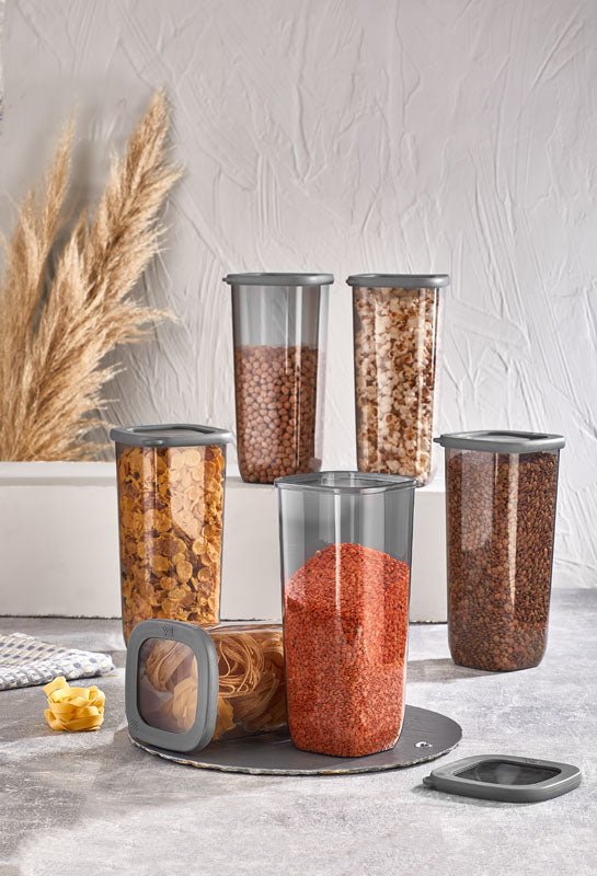 Setzen Sie in Ihrer Küche auf Best Practice: KUMSAI Vorratsdosen 6er Set in elegantem Grau – quadratisch, je 1,75 L, luftdicht und stapelbar. Transparent für sofortige Sichtprüfung, formstabil für saubere Stapel-Logik. So bleibt der Vorrat länger frisch und die Abläufe in der Küche sind