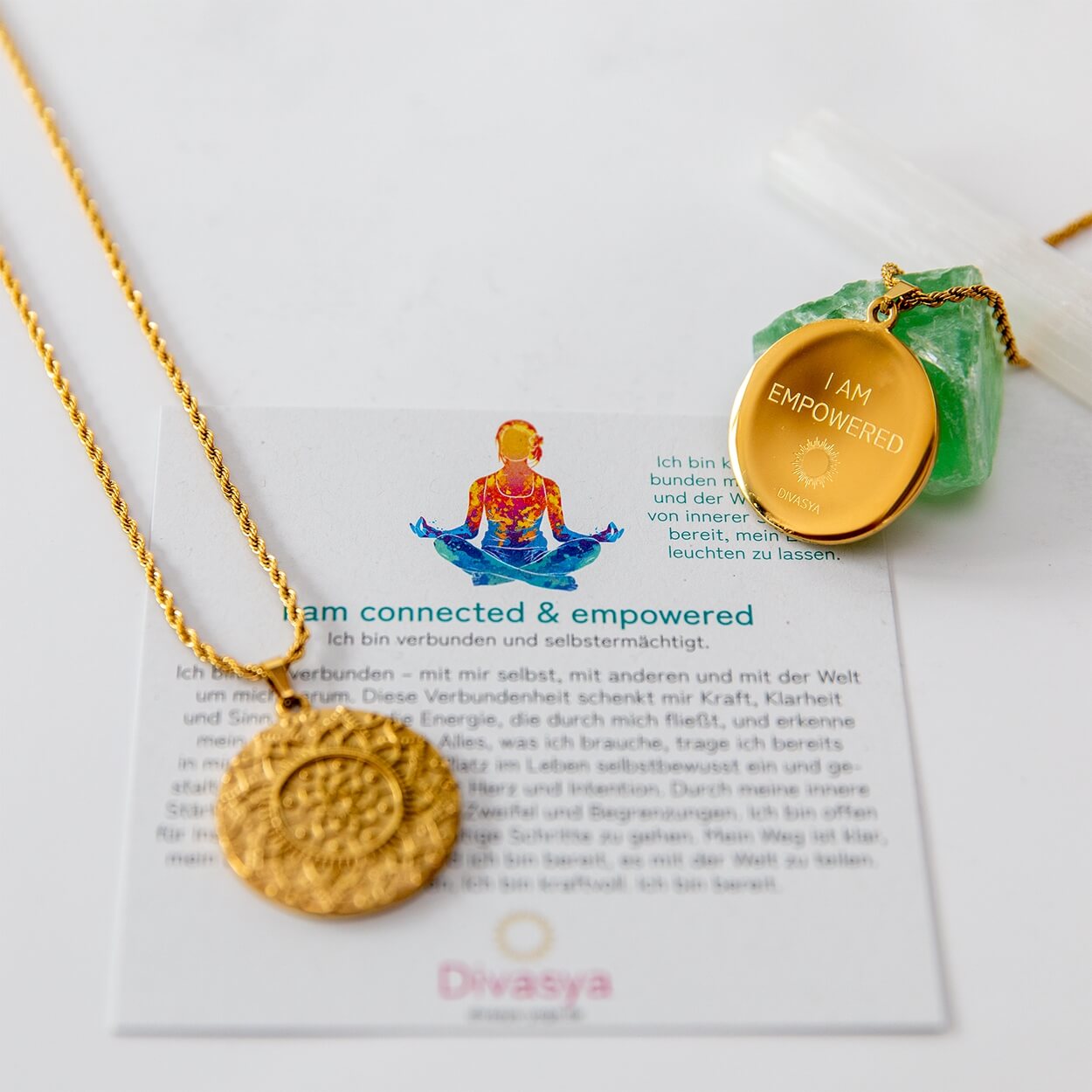 Diese besondere spirituelle Kette ist weit mehr als nur ein Accessoire. Sie ist ein stiller Begleiter, der Dich sanft daran erinnert, wie stark und kraftvoll Du bist – jeden Tag. Ob als persönlicher Talisman oder als bedeutungsvolles Geschenk für einen lieben Menschen: Die Kette mit Mandala-Anhänger und Gravur „I am empowered“ verbindet feine Eleganz mit einer starken Botschaft, die Dein Selbstvertrauen stärkt und Dich daran erinnert, Deine innere Stärke zu leben.