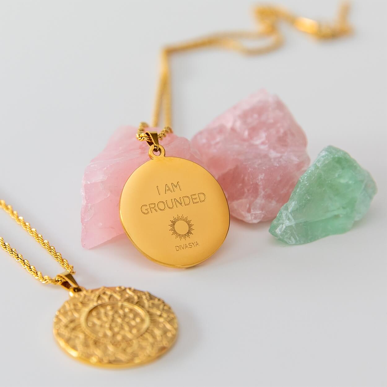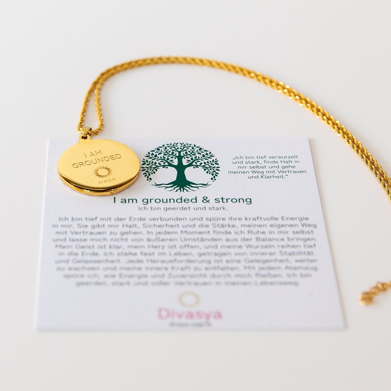 - Mandala-Anhänger mit Lasergravur auf der Rückseite: „I am grounded“