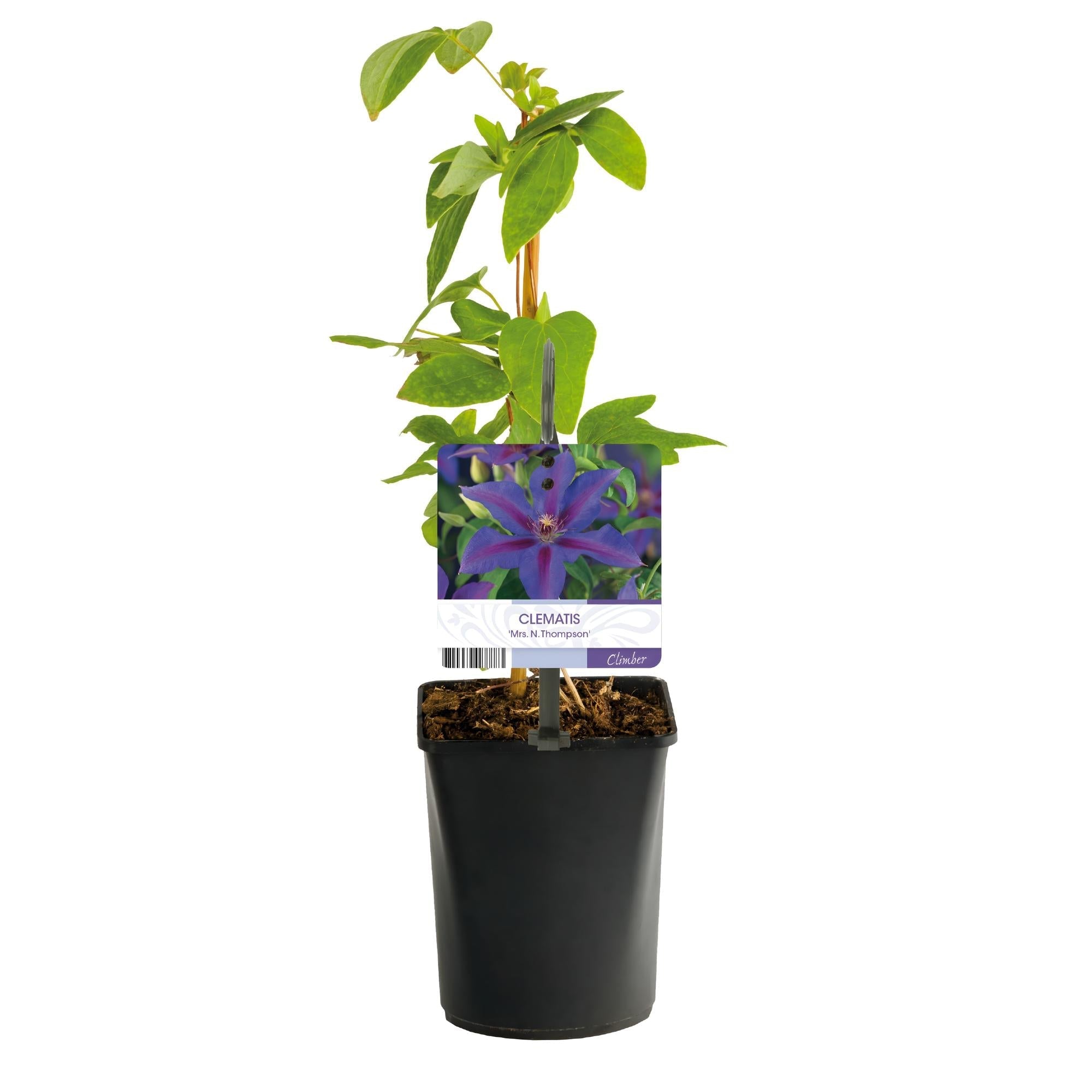 Die Clematis 'Mrs. N. Thompson' ist eine elegante Kletterpflanze, die von späten Frühling bis frühen Herbst mit reichen, lila Blüten Ihren Garten verschönert. Mit einer Wuchshöhe von bis zu 2–3 Metern eignet sie sich hervorragend für die Begrünung von Spalieren, Zäunen oder Wänden und bringt lebendige Farbe in jeden Außenbereich.