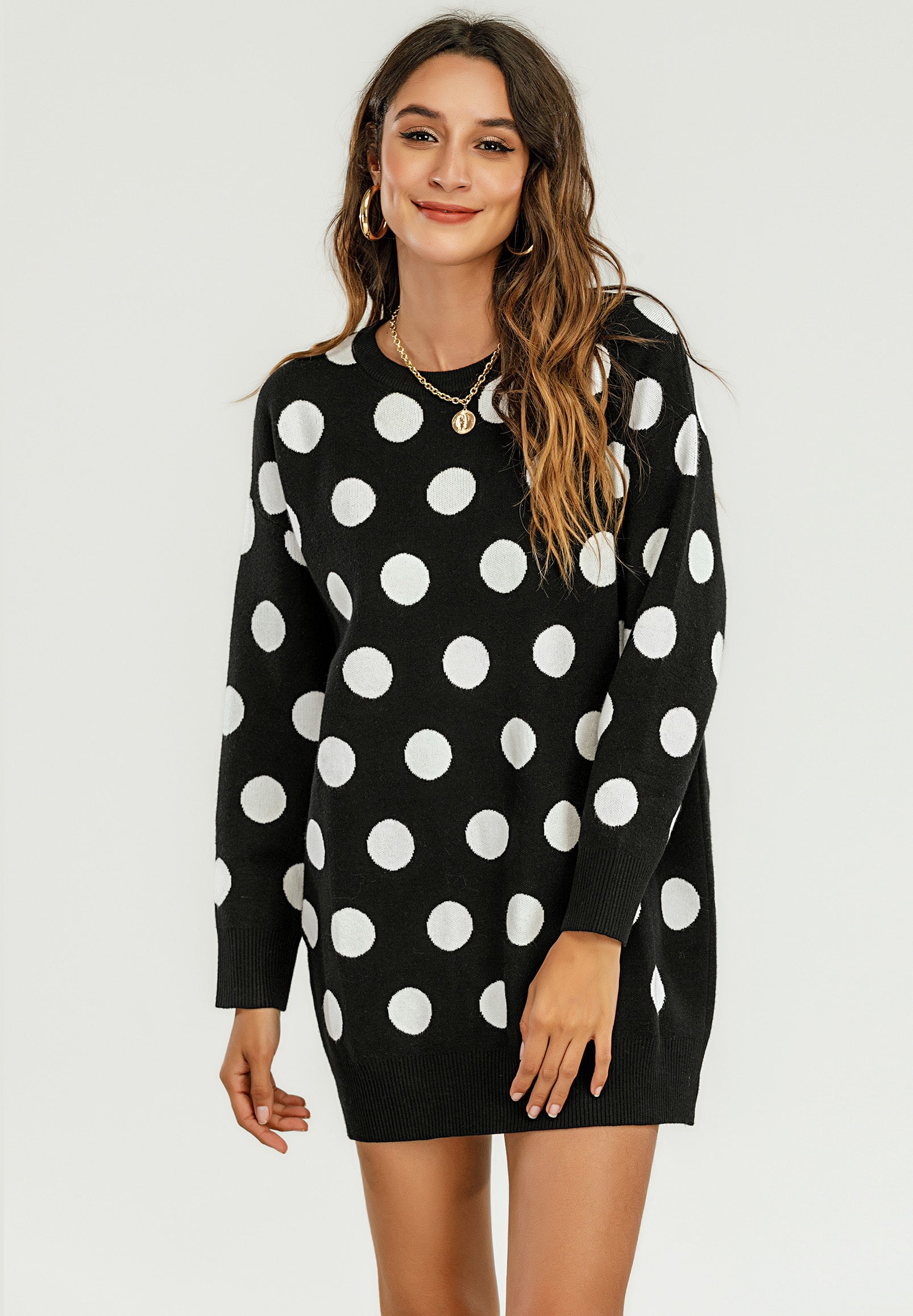 Knitted Tunic Mini Jumper Dress With Polka Dot Pattern