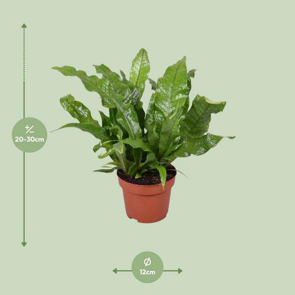 Mit seiner kompakten Größe von Ø12cm Topf und einer Höhe von ca. 30cm ist der Microsorum crocodyllus perfekt für Regale, Tische oder als dekorativer Akzent im Raum. Neben seinem besonderen Aussehen wirkt er zudem luftreinigend und trägt zu einem gesünderen Raumklima bei.
