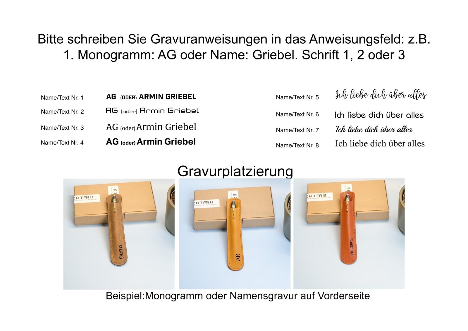 Sie können zwischen einer Monogramm- oder Namensgravur auf dem Etui des Stiftes wählen. Dazu geben Sie die folgenden Angaben in das Gravurfeld ein. Bitte sehen Sie die Fotos in der Auflistung für die Schriftarten.