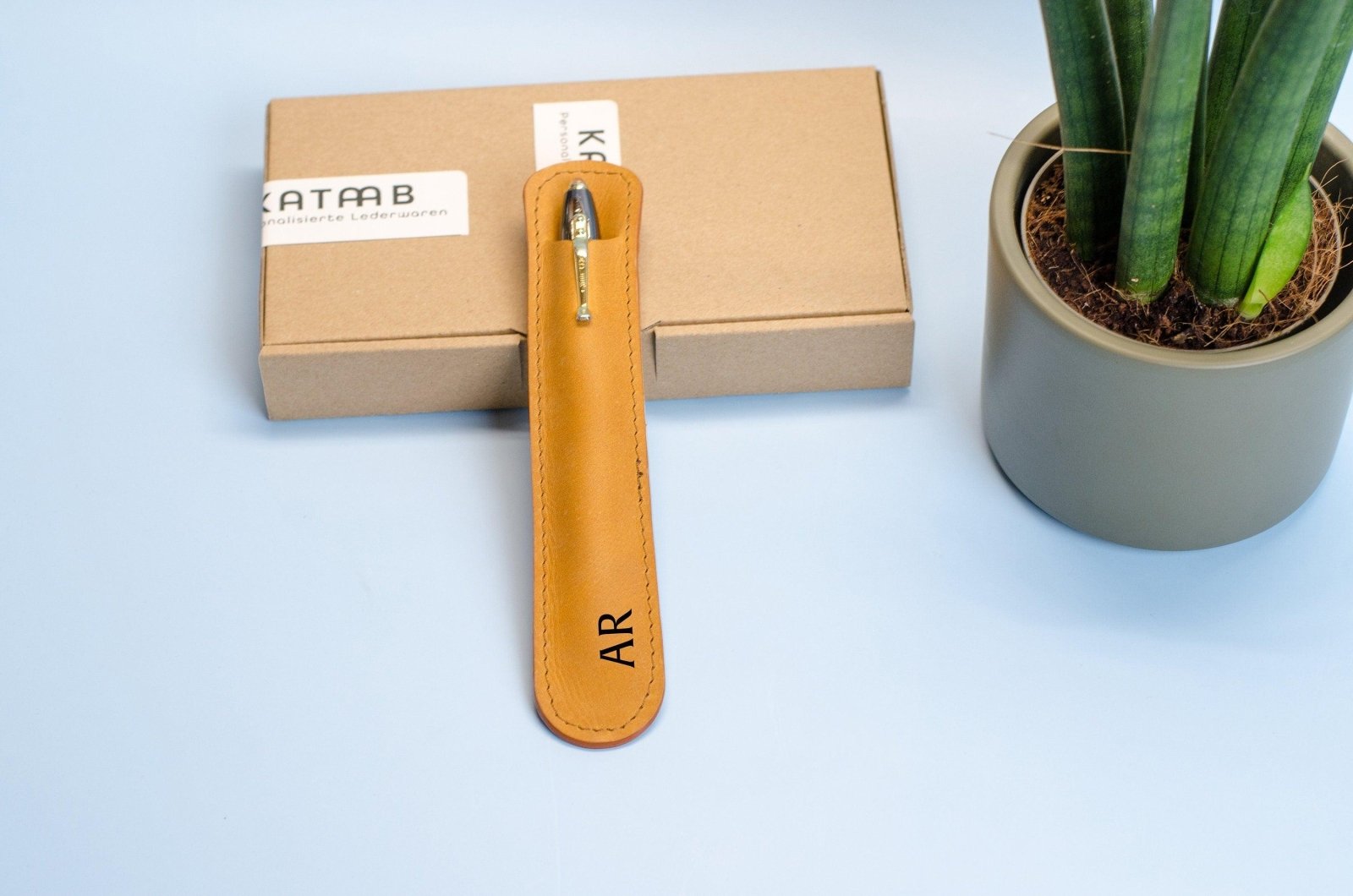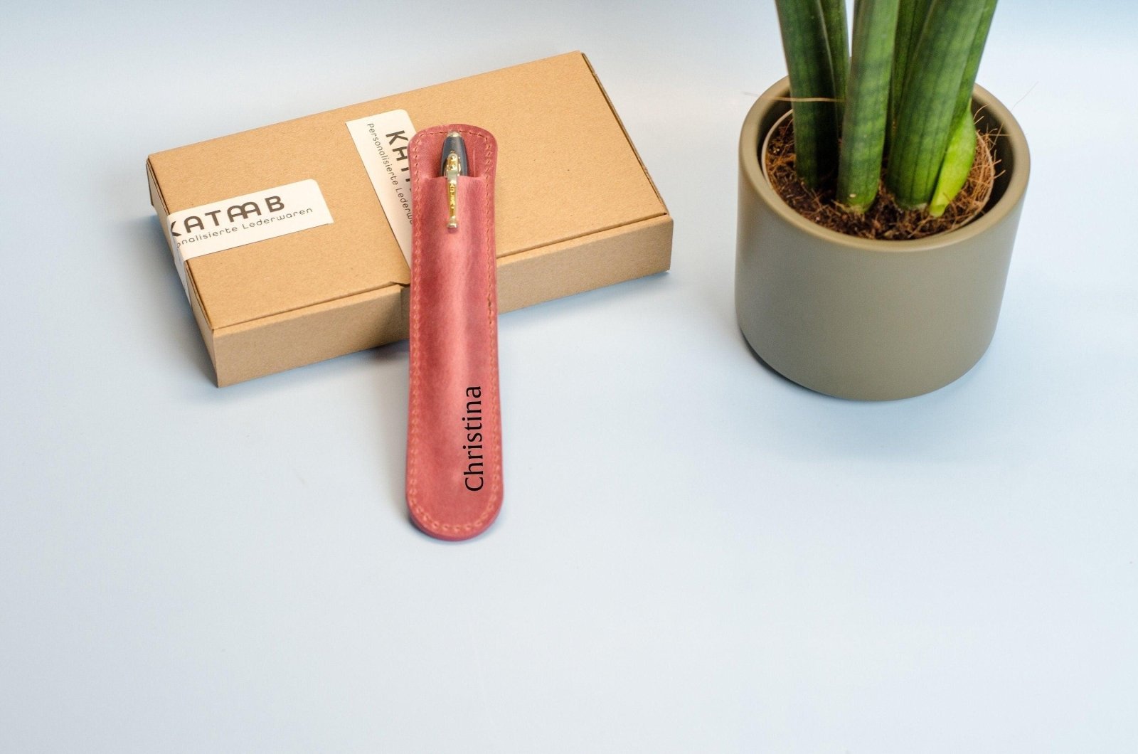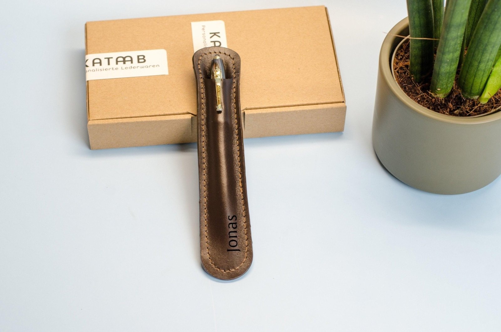 Lederetui für einen Kugelschreiber mit Gravur. Personalisiertes Stiftetui aus Leder. Leder Stifthülle mit Namen Gravur.Größe cir. 17x3,5cm.