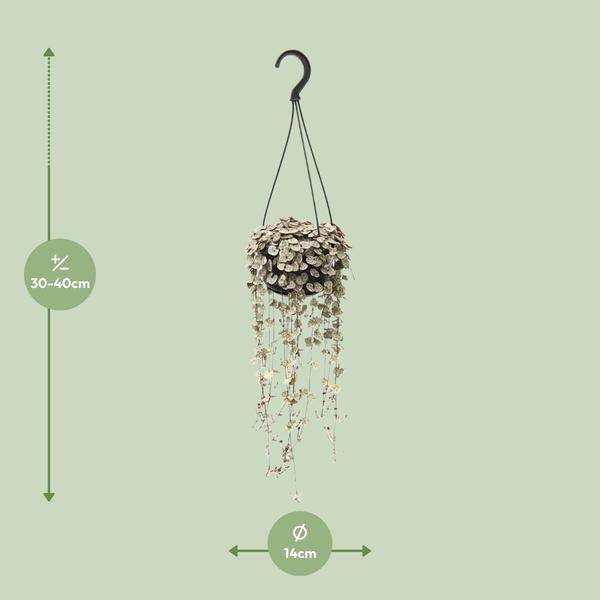 Mit einer Höhe von ca. 38cm und einem Ø14cm Topf eignet sich diese Pflanze perfekt für Hängeampeln, Makramee-Halter oder Regale, wo ihre langen Ranken elegant herabfallen. Dank ihrer dekorativen Optik wird sie auch oft als „String of Hearts“ bezeichnet.