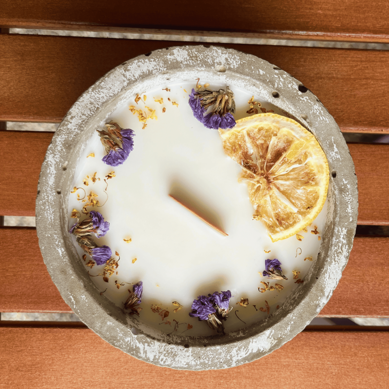 • Material: Veganes Sojawachs, versiegelter Beton, Holzdocht, getrocknete Blüten.