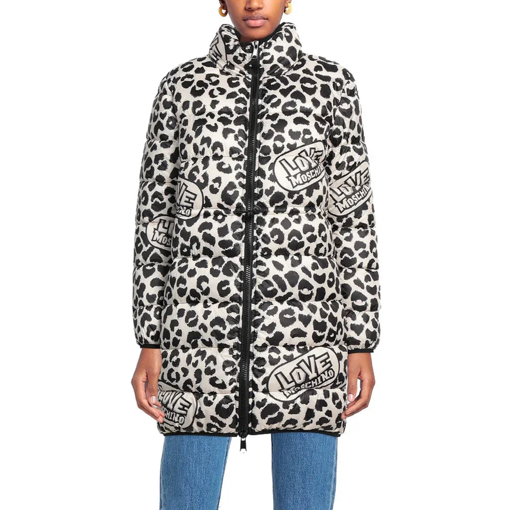 Love Moschino long polyester down jacket with leopard-themed print and logos all over the surface Lesen Sie mehr