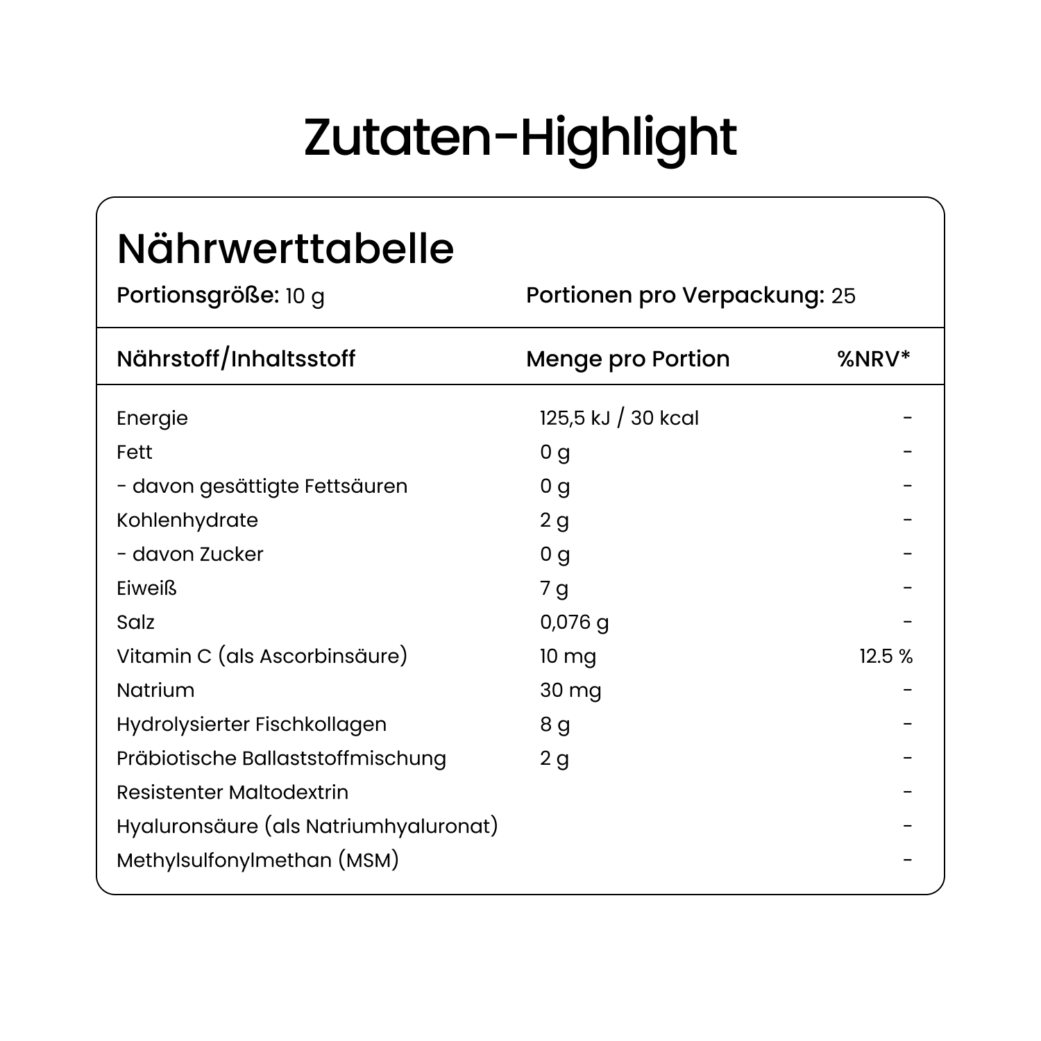 Each serving (10 g) provides 10 mg hyaluronic acid, 2 g resistant maltodextrin, 2 g MSM, and 500 mg L-proline.