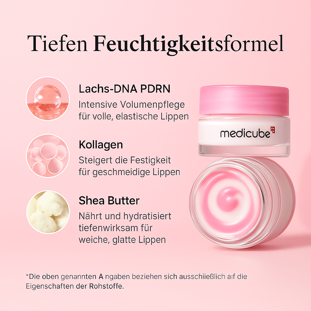 Die einzigartige Formel vereint das Beste aus koreanischer Kosmetik und moderner Wirkstofftechnologie. PDRN, gewonnen aus Lachs-DNA, unterstützt die natürliche Zellerneuerung und fördert die Regeneration der Lippenhaut. Kollagen sorgt für spürbar mehr Festigkeit, während Sheabutter die Haut tiefenwirksam nährt und vor dem Austrocknen schützt. Das Ergebnis: sichtbar prallere, glattere Lippen mit einem gesunden Glanz.