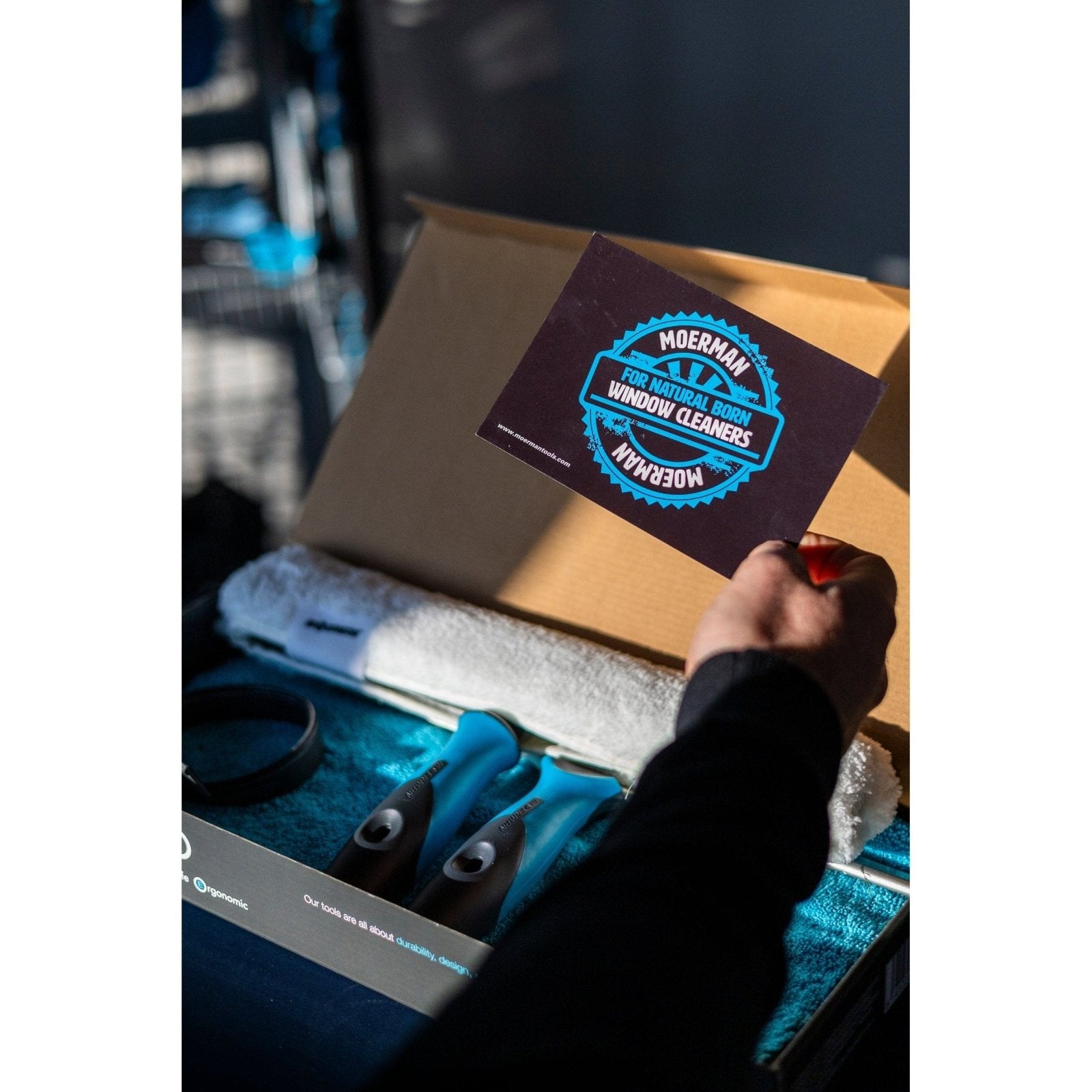 Inhalt: 1 x MOERMAN Fensterwischer komplett in 35 cm Ergonomischer Wischer für streifenfreies Abziehen1 x MOERMAN Einwascher komplett in 35 cm Ergonomischer Einwascher zum Einschäumen und Schmutz anlösen1 x MOERMAN Sicherheitsschaber Entfernt hartnäckige Verschmutzungen auf der Scheibe1 x MOERMAN Premium Mikrofasertuch Zum Nacharbeiten für z. B. kleine Wasserflecken1 x MOERMAN Sticker Sieht einfach cool aus :)