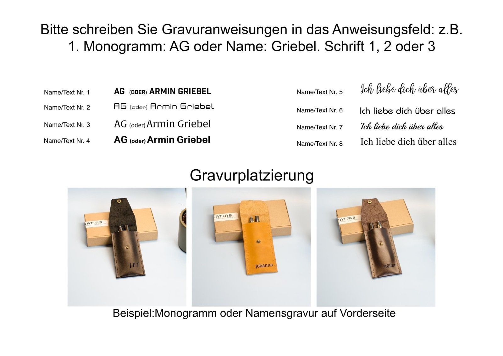 Sie können zwischen einer Monogramm- oder Namensgravur auf dem Etui des Stiftes wählen. Dazu geben Sie die folgenden Angaben in das Gravurfeld ein. Bitte sehen Sie die Fotos in der Auflistung für die Schriftarten.