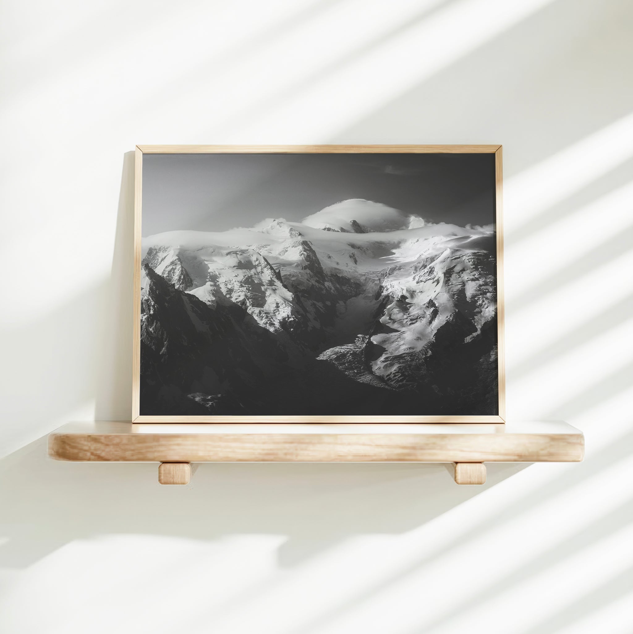 A striking black and white print of Mont Blanc Massif, where sharp peaks meet deep shadows. A timeless Alpine landscape,... Lesen Sie mehr