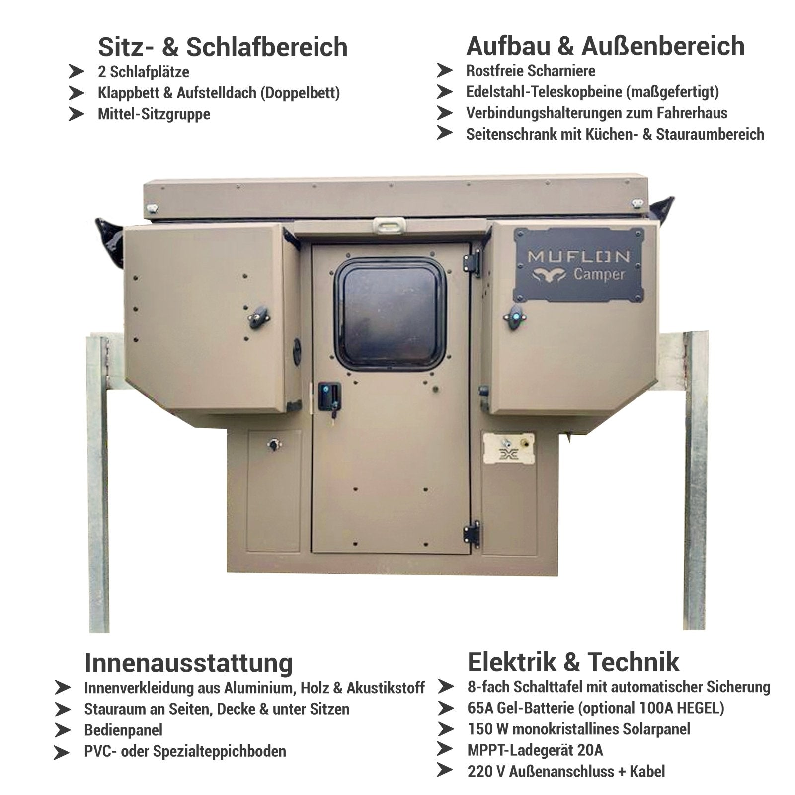 Hier zählt Substanz: Aluminium-Leichtbau, isoliertes Pop-Up-Dach, klare Sitz-/Schlaflogik und ein robustes 12 V/230 V-Energiesetup mit MPPT. Markise, Diesel-Heizung und Solar stellen Autarkie sicher – ob Wochenendflucht oder Langstrecke. Die CAN-Kombi-Küche und die REIMO Außenbrause liefern praxistauglichen Mehrwert, der sich in der Szene über Jahre bewährt hat.