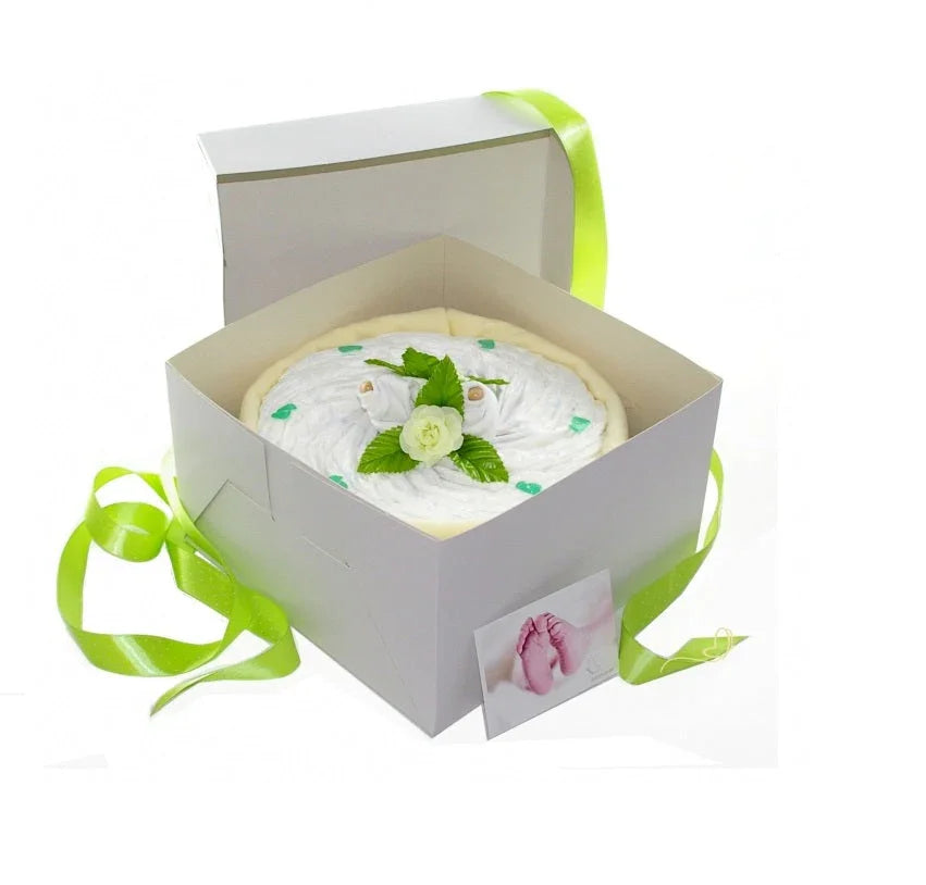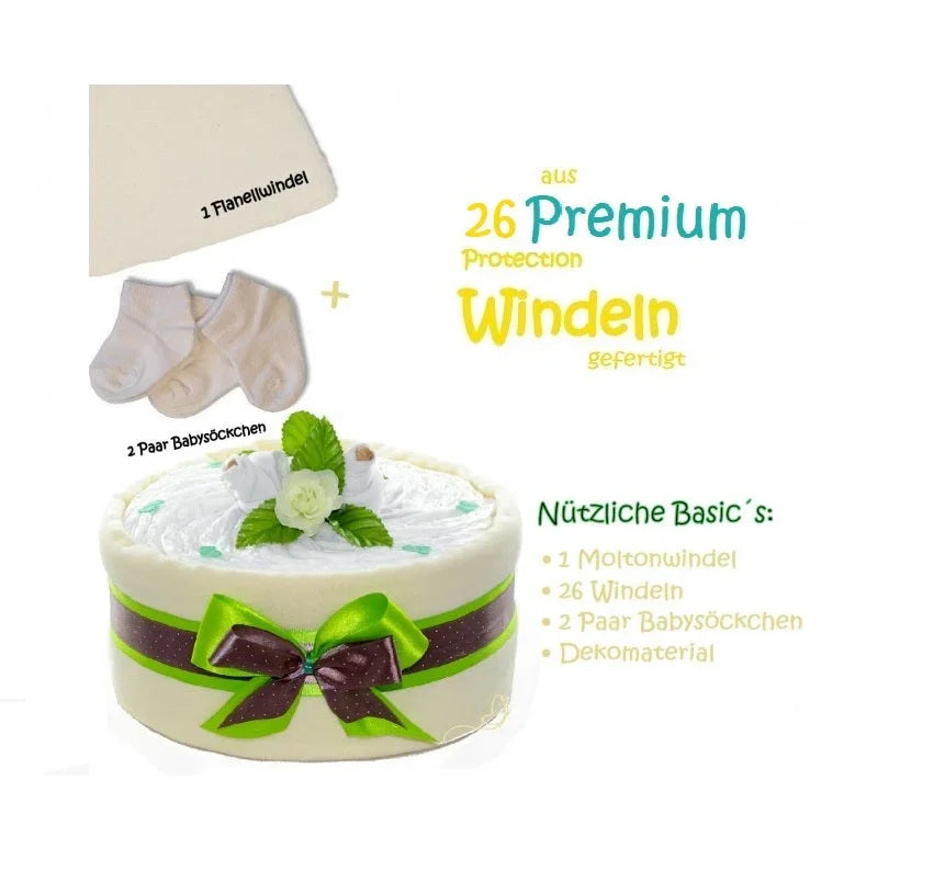 Neutrale Windeltorte grün in Cakebox . Beschreibung 26 Premium Protection Windeln Gr. 2 (3-6 kg) 2 Paar Babysöckchen in neutralen Farben,... Lesen Sie mehr