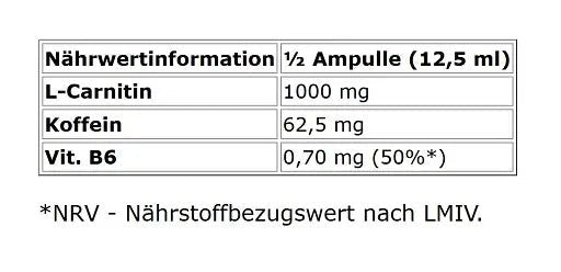 ½ Ampulle (12,5 ml) einmal täglich ca. 30 Minuten vor dem Training trinken. 1 Ampulle enthält 2 Portionen. Nach dem Öffnen kühl lagern und innerhalb von 48 Stunden verzehren. Vor Gebrauch schütteln.