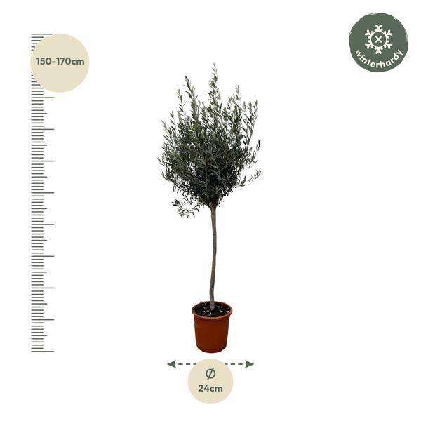 Der Olivenbaum (Olea Europaea) ist ein mediterraner Klassiker, der mit seinem eleganten Erscheinungsbild sofort Urlaubsfeeling in Haus und Garten bringt. Mit einer Höhe von ca. 160cm und einem Topfdurchmesser von Ø24cm ist er ein stilvoller Blickfang für Terrasse, Balkon, Wintergarten oder helle Wohnräume.