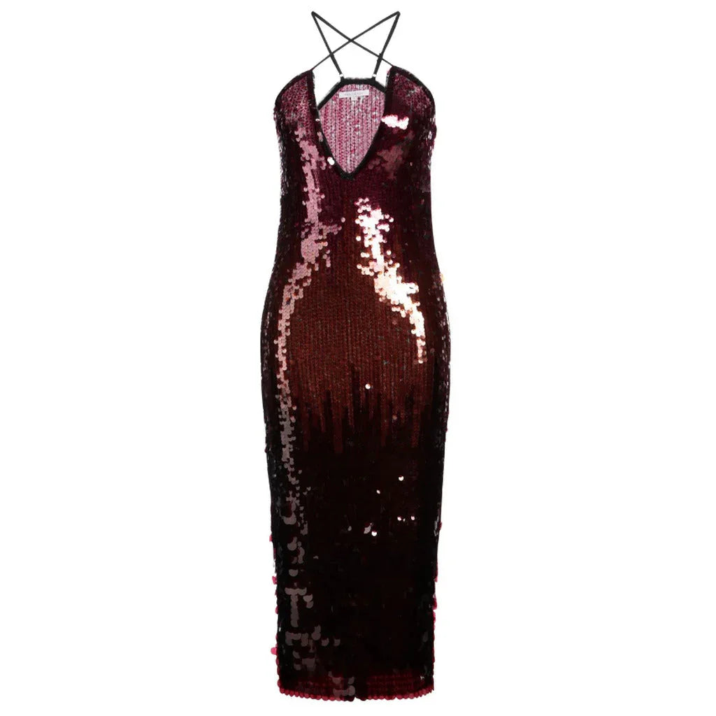 Patrizia Pepe long, fitted dress entirely covered in burgundy sequins with a shiny finish. It features a deep V-neck and... Lesen Sie mehr