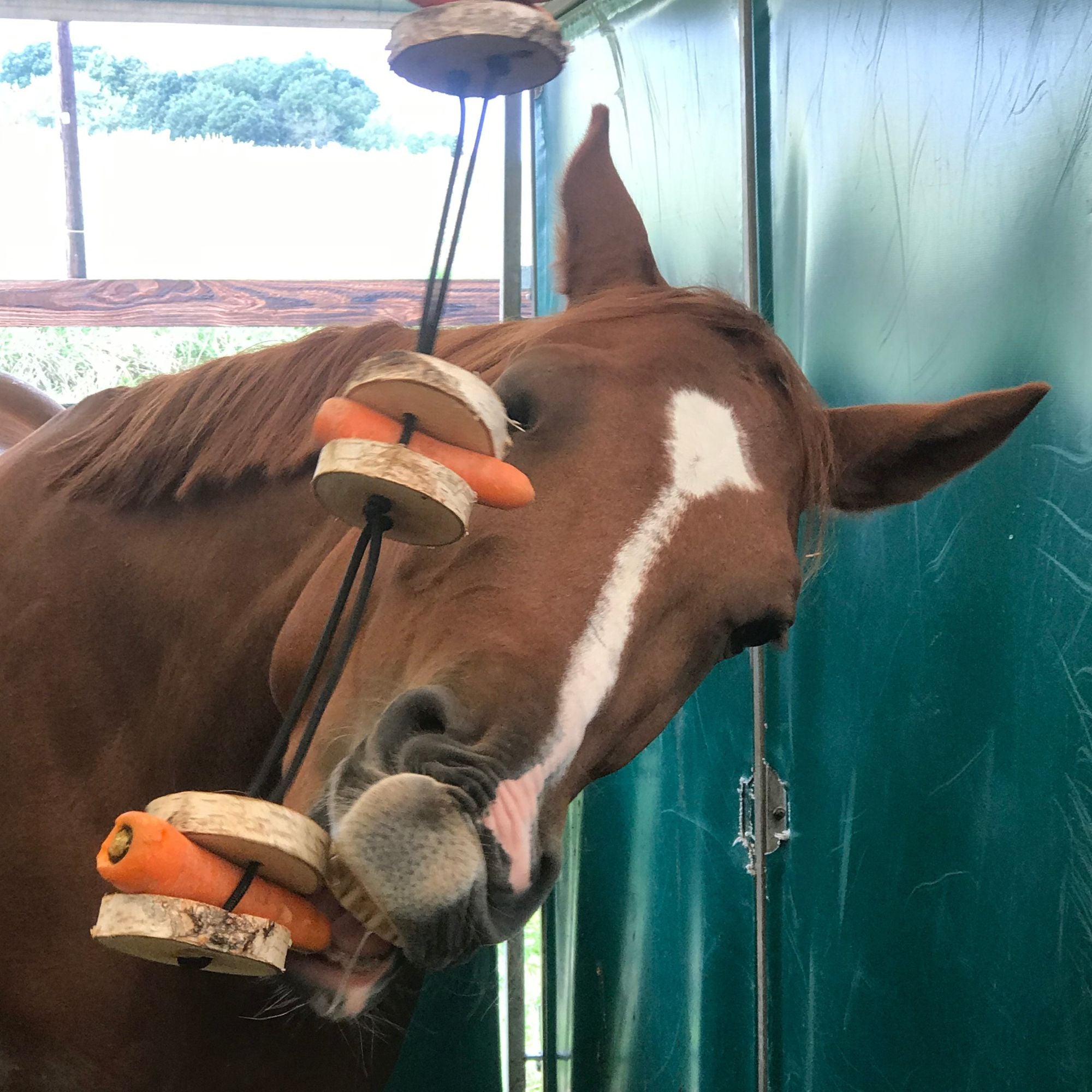 Durch die stabilen Expanderseile werden die Karotten, Apfelstücke oder Leckerlis sicher zwischen den Holzscheiben gehalten, sodass dein Pferd sich anstrengen muss, um sie herauszuziehen. Du kannst den Schwierigkeitsgrad individuell anpassen – nicht nur durch die Länge der Karotten, sondern auch dadurch, ob du das Pferdespielzeug freihängend anbringst. Ein frei aufgehängter Möhren-Tarzan sorgt für zusätzlichen Spaß und Herausforderung.