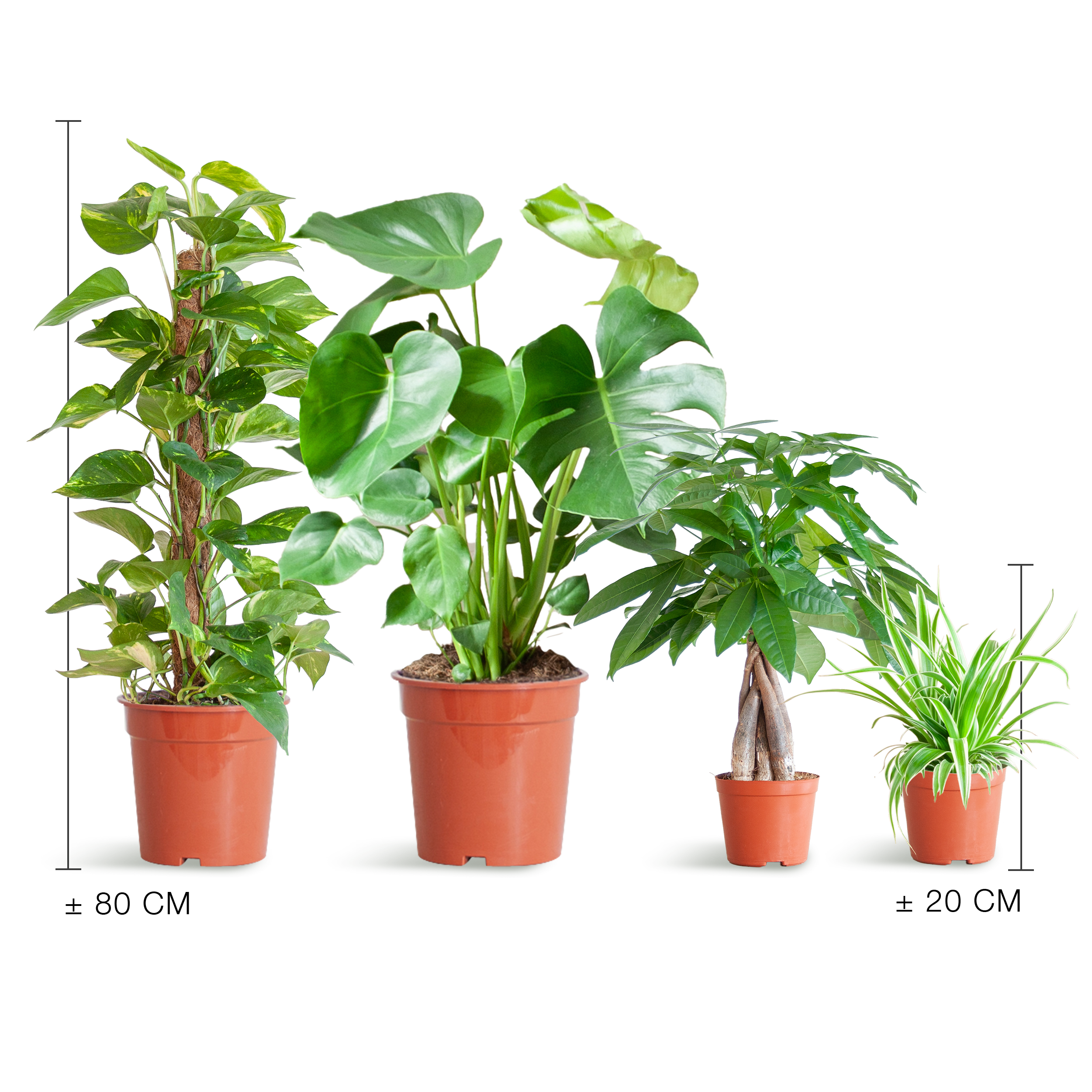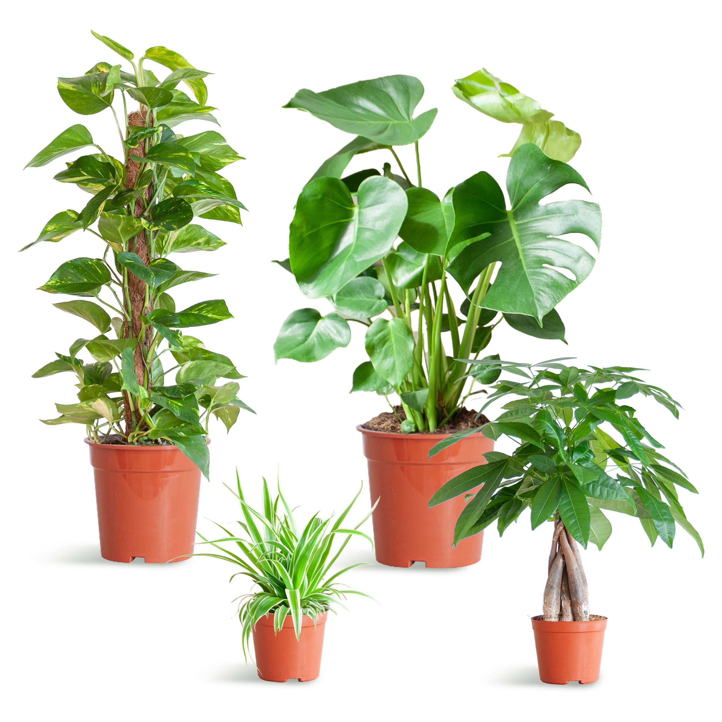 🌿 Grüner Mix fürs Zuhause: Mit Monstera, Epipremnum auf Moosstab, Pachira & Grünlilie – natürliche Vielfalt im Set.