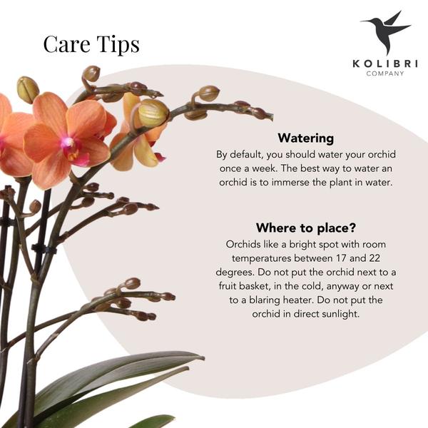 Die Pflanze wird ohne Übertopf geliefert, sodass Sie sie individuell in einen Topf Ihrer Wahl setzen können – besonders stimmig wirken Terrakotta-Töne oder helle, sandige Farben. Mit einer kompakten Topfgröße von Ø9cm lässt sich die Orchidee vielseitig platzieren – ob auf der Fensterbank, dem Sideboard oder dem Schreibtisch.