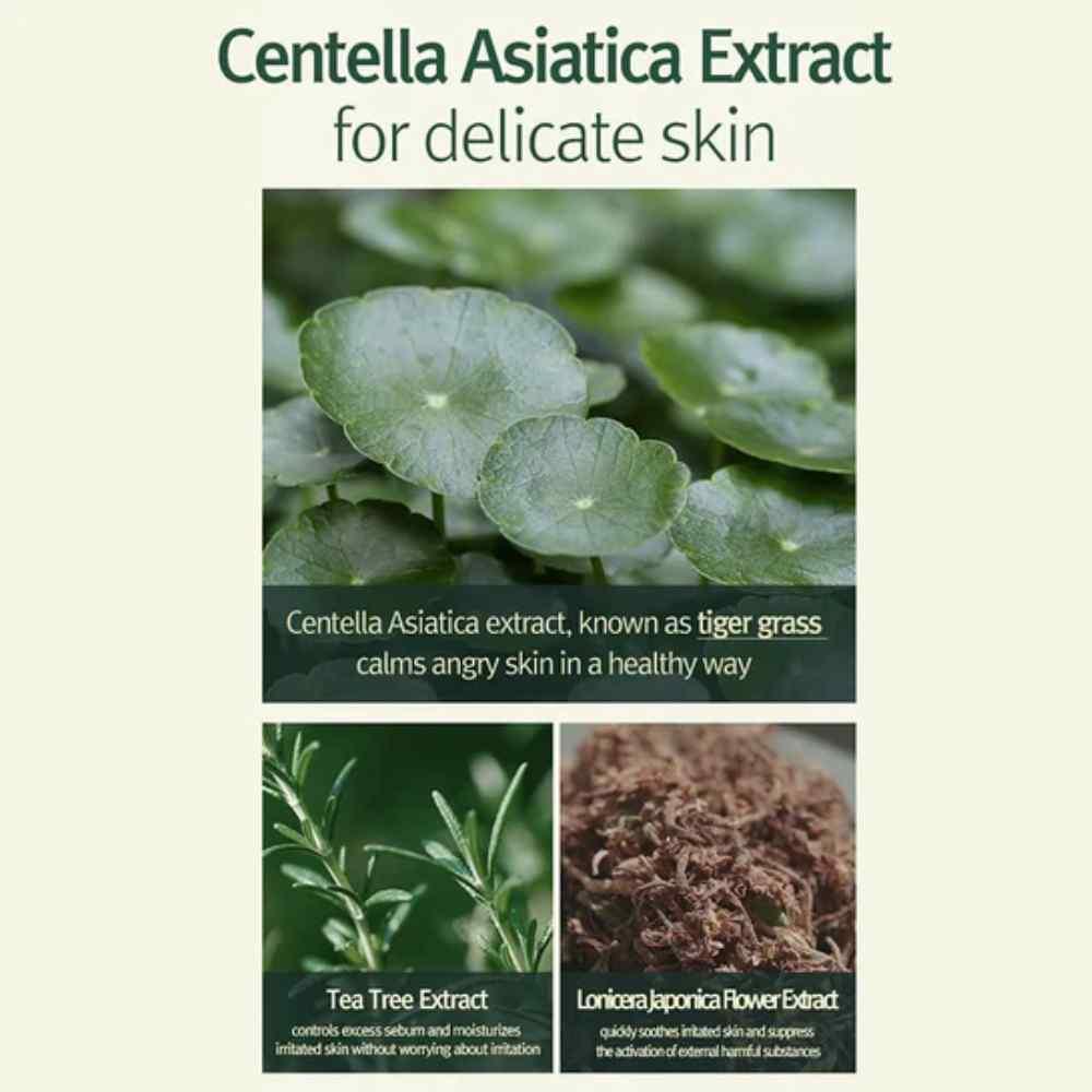 Water, Glycerin, Methylpropanediol, Trehalose, Betaine, Allantoin, Lonicera Japonica (Honeysuckle) Flower Extract, Melaleuca Alternifolia (Tea Tree) Leaf Extract, Salvia Officinalis (Sage) Leaf Extract, Camellia Japonica Flower Extract, Sodium Hyaluronate, Hydrolyzed Hyaluronic Acid, Hydroxypropyltrimonium Hyaluronate, Sodium Hyaluronate Crosspolymer, Sodium Acetylated Hyaluronate, Acetyl Hexapeptide-8, Palmitoyl Tripeptide-5, Madecassoside, Madecassic Acid, Asiaticoside, Asiatic Acid, Centella Asiatica Extract, Centella Asiatica Leaf Extract, Ceramide NP, Dipotassium Glycyrrhizate, Arginine, Lecithin, Citric Acid, Gluconolactone, Butylene Glycol, Caprylyl Glycol, Hydroxyacetophenone, Pentylene Glycol, Dipropylene Glycol, Caprylic/Capric Triglyceride, Ethylhexyl Palmitate, Cetyl Ethylhexanoate, Polyglyceryl-10 Myristate, Acrylates/C10-30 Alkyl Acrylate Crosspolymer, Tromethamine, Xanthan Gum, Disodium EDTA, 1,2-Hexanediol