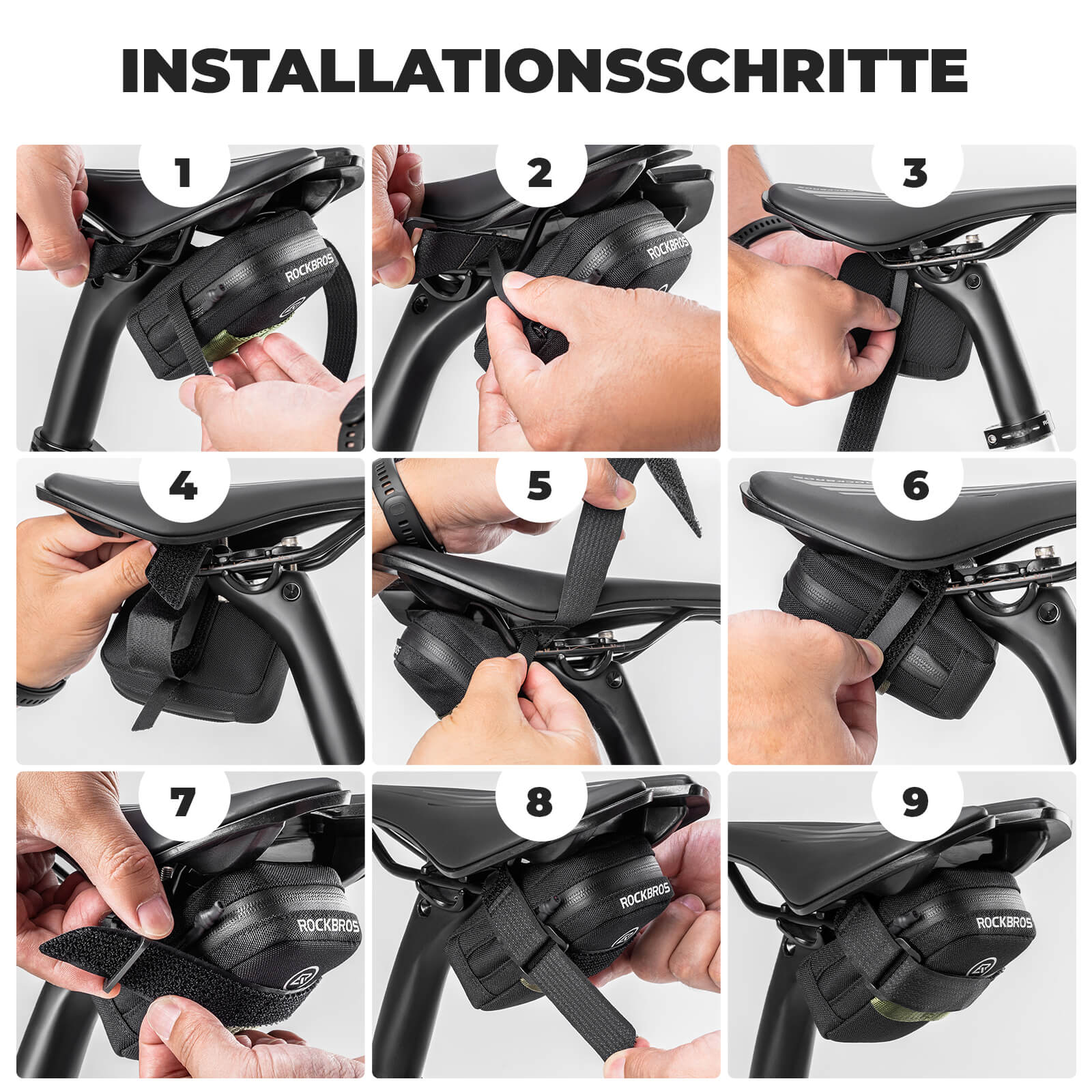 EINFACHE MONTAGE: Die Tasche lässt sich problemlos an alle Sattelgestelle anbringen. Dank des Klettverschlusses ist die Montage und Demontage schnell und einfach. Die Tasche bleibt sicher an ihrem Platz und verhindert, dass sie während der Fahrt herunterfällt.