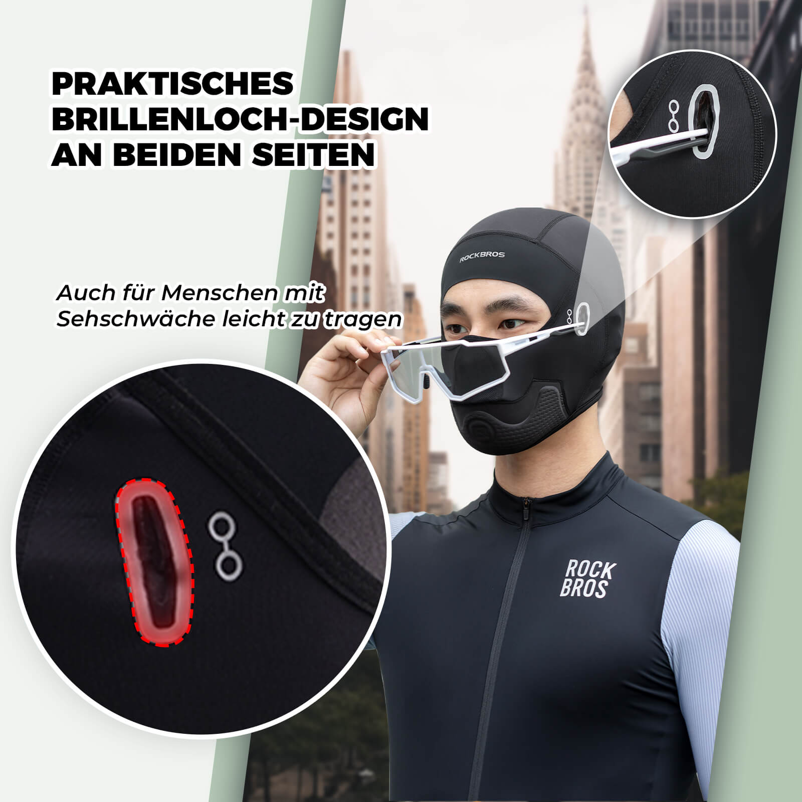 Zwei kleine Löcher an den Seiten der Maske ermöglichen das bequeme Tragen einer Brille. Das reflektierende Logo verbessert die Sichtbarkeit bei Nachtfahrten.