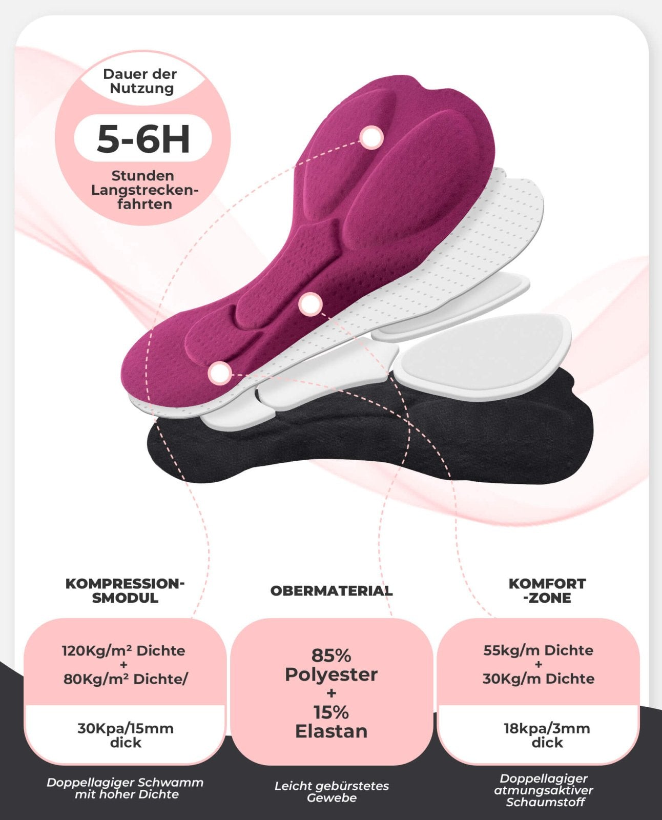 Unsere Damen-Radhosen sind mit einer hochdichten Polsterung ausgestattet, die für außergewöhnlichen Komfort und Dämpfung bei langen Fahrten sorgt.