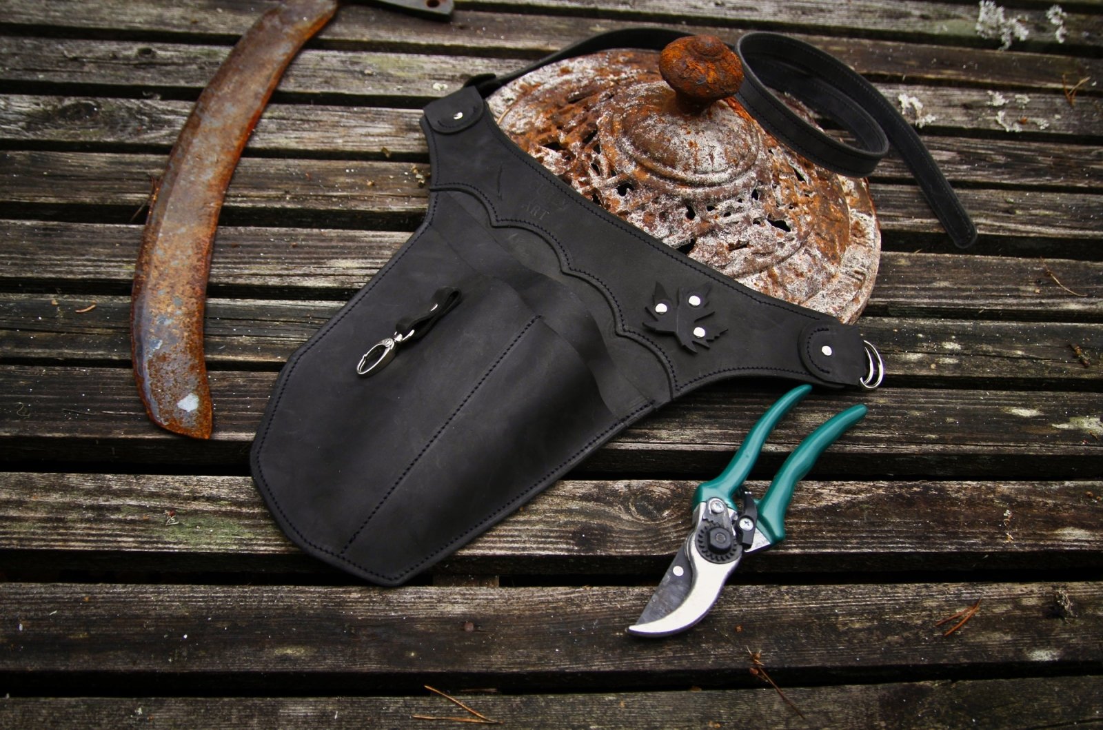 Der Garten Werkzeuggürtel ist aus so genanntem Crazy Horse Rindsleder in schwarz gefertigt.