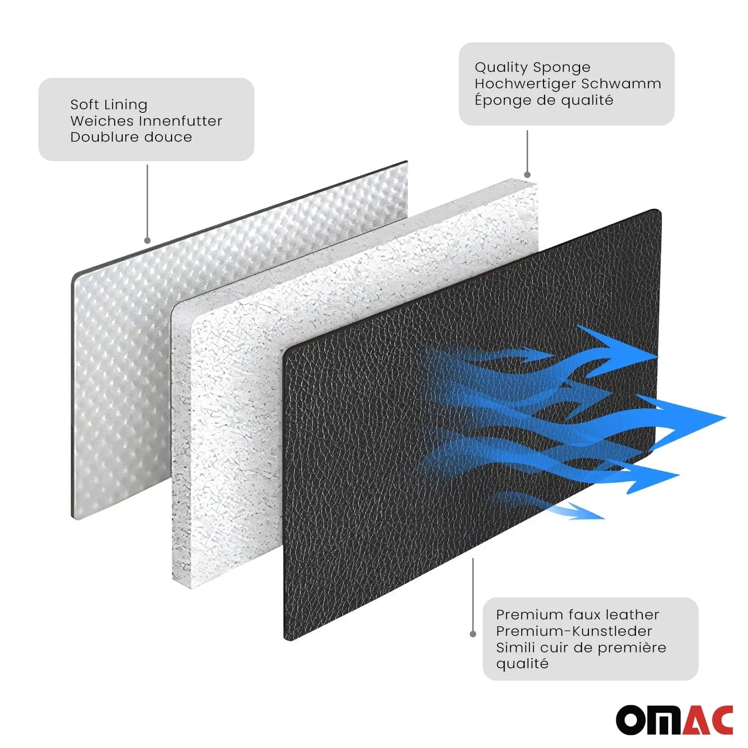 Gönnen Sie sich den Luxus unseres hochwertigen PU-Ledermaterials, das sich weich anfühlt und Sie jedes Mal, wenn Sie in Ihr Fahrzeug einsteigen, in eine einladende Umarmung versetzt. Neben dem Komfort sorgt die Atmungsaktivität des PU-Leders dafür, dass die Fahrt unabhängig von der Jahreszeit angenehm bleibt, denn es bietet das ganze Jahr über eine Temperaturregelung, die sich an Ihre Umgebung anpasst. Die Sitzbezüge sind mit einer fortschrittlichen, spritzwassergeschützten Technologie ausgestattet und bilden eine undurchdringliche Barriere gegen die Strapazen des täglichen Pendelns und unerwartete Missgeschicke.