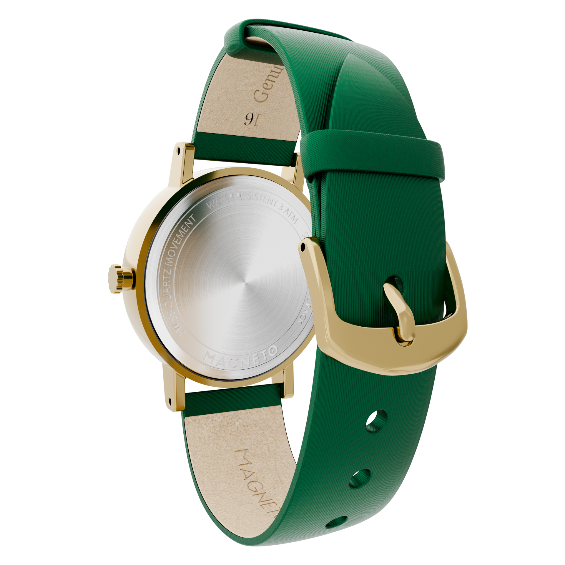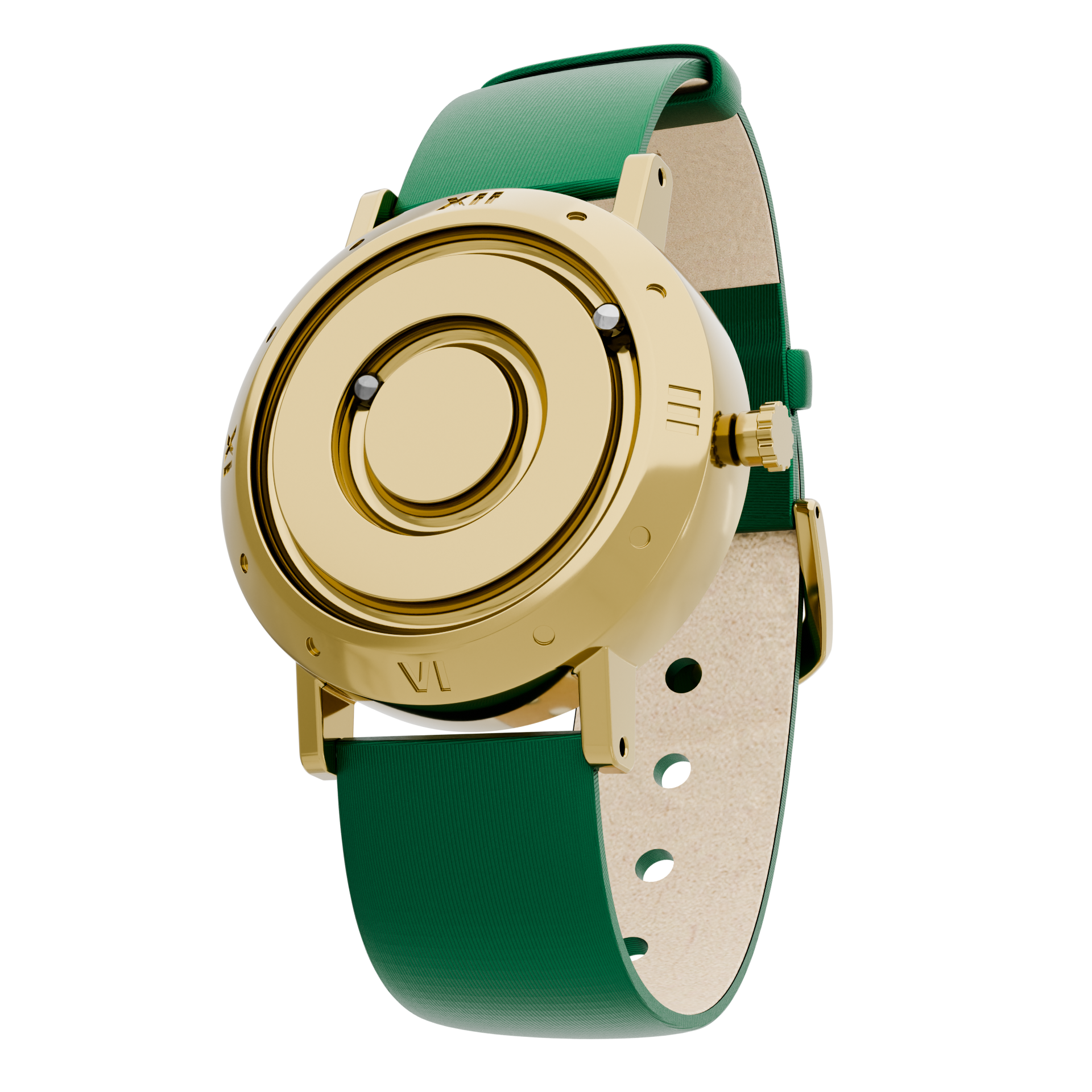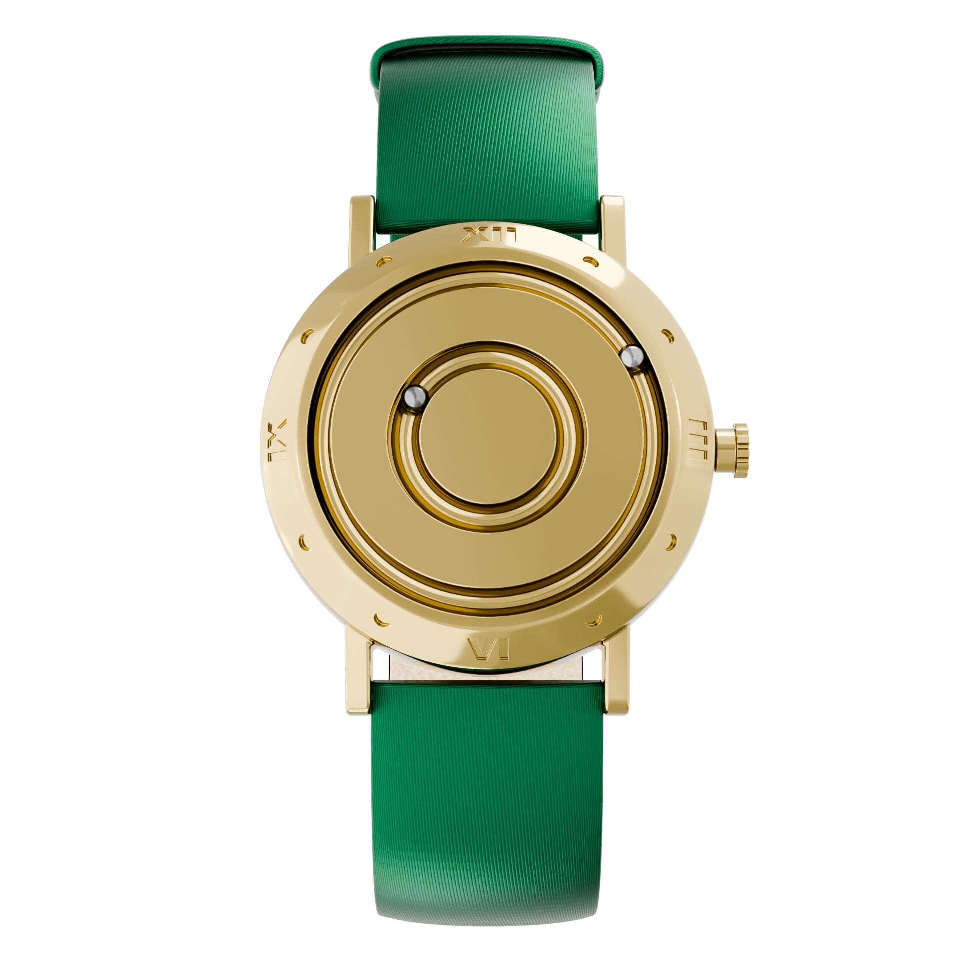 Das glänzend-goldene Zifferblatt mit spiegelnder Oberfläche verleiht der Stella Gold eine auffallend edle Ausstrahlung. Das goldfarbene Gehäuse aus hochwertiger Alloy sorgt für eine zeitlose Eleganz, die sofort ins Auge fällt. Als stilvoller Kontrast ergänzt das grüne Satin-Lederarmband das Design mit einer frischen, modernen Note – weich, komfortabel und absolut einzigartig.