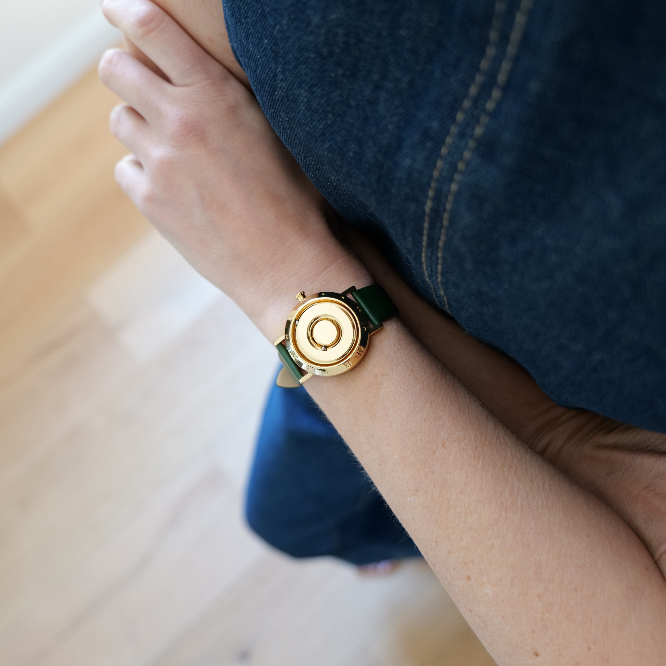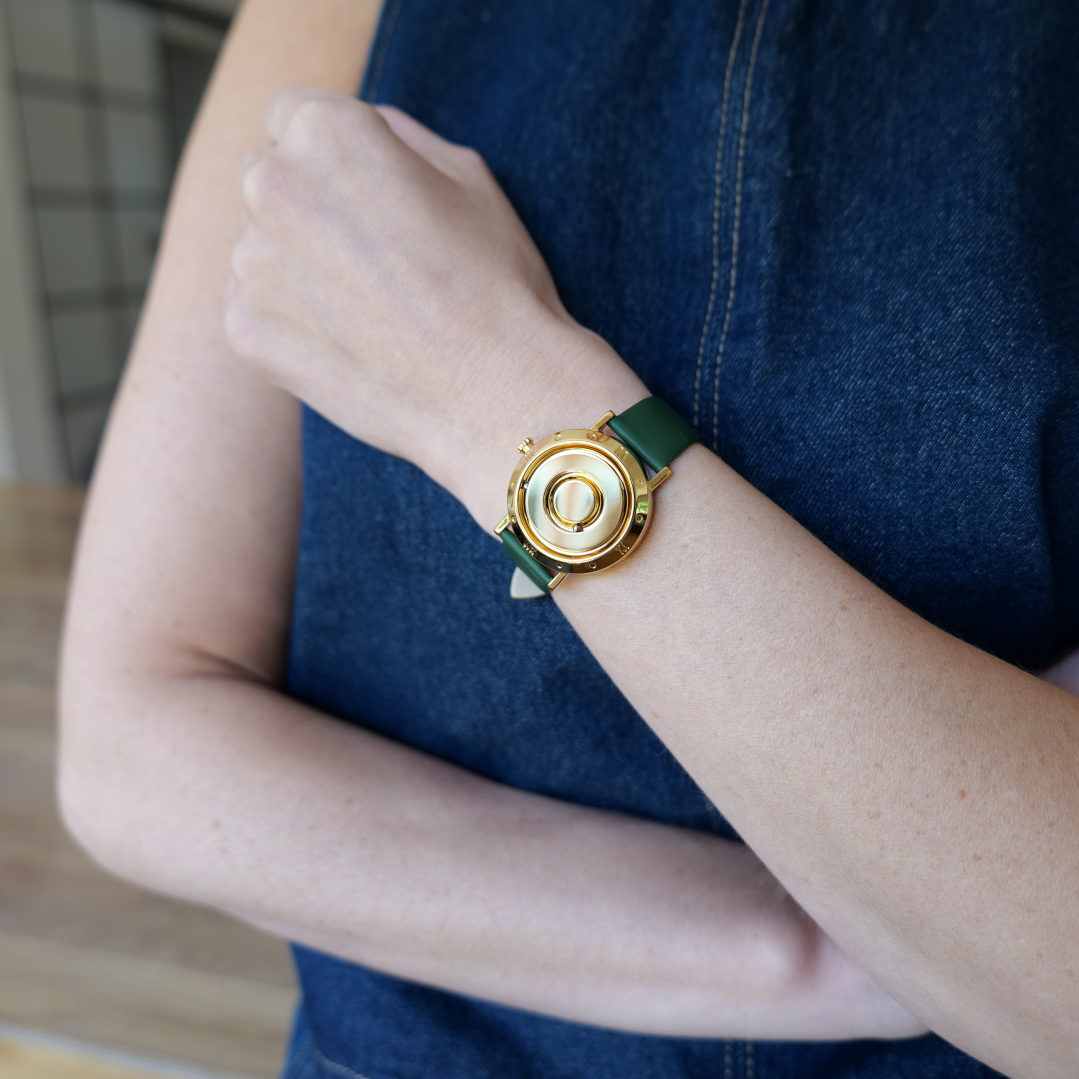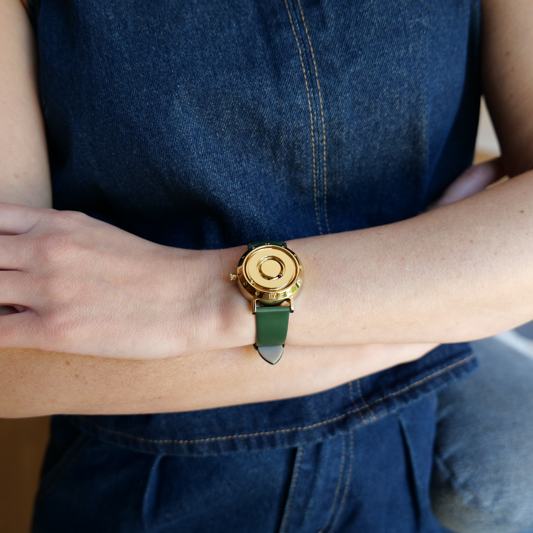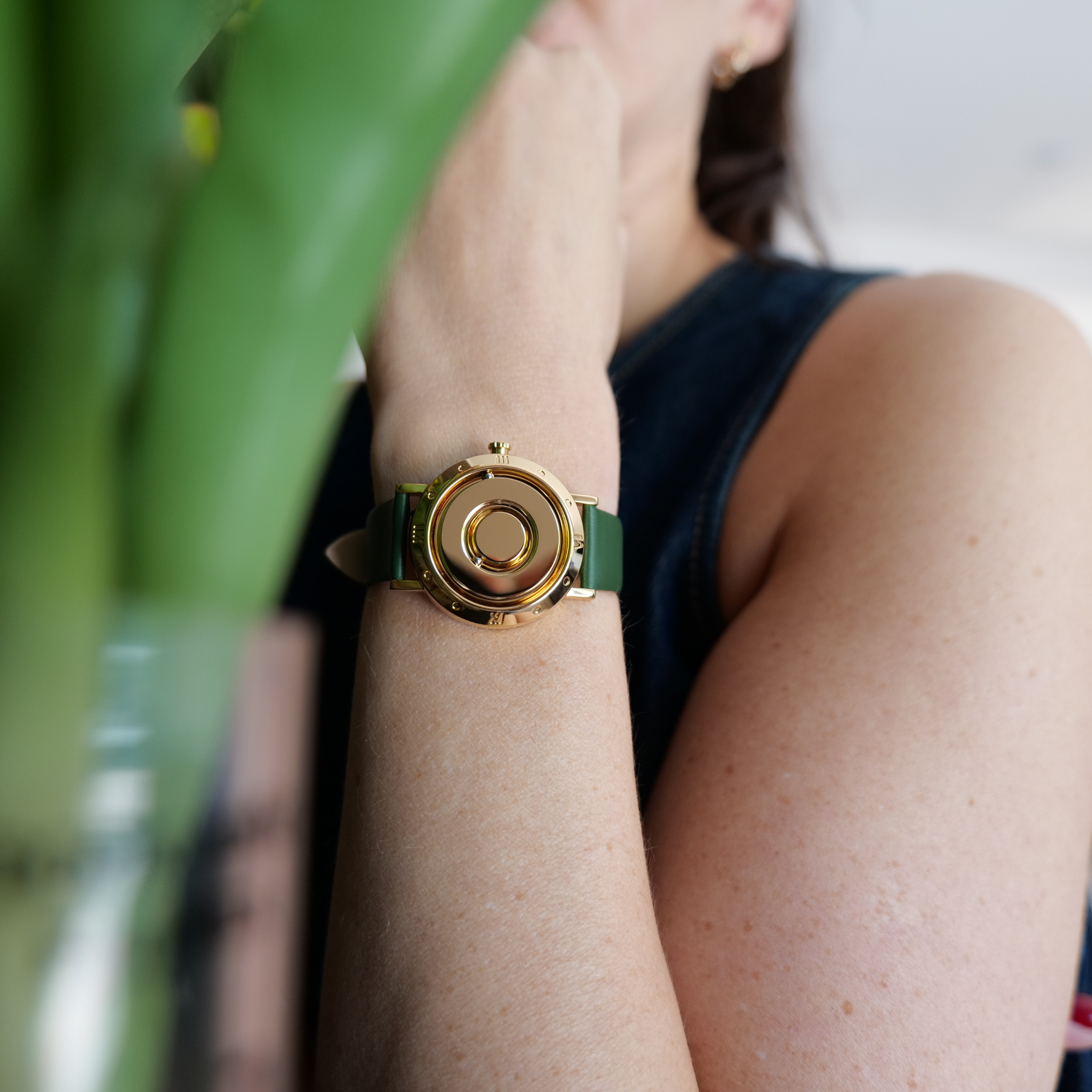 Das glänzend-goldene Zifferblatt mit spiegelnder Oberfläche verleiht der Stella Gold eine auffallend edle Ausstrahlung. Das goldfarbene Gehäuse aus hochwertiger Alloy sorgt für eine zeitlose Eleganz, die sofort ins Auge fällt. Als stilvoller Kontrast ergänzt das grüne Satin-Lederarmband das Design mit einer frischen, modernen Note – weich, komfortabel und absolut einzigartig.