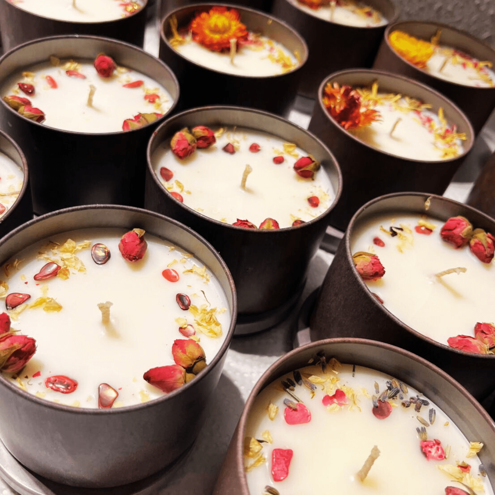 Hinweis: Die Kerze ist mit getrockneten Blüten dekoriert, die bei Kontakt mit der Flamme dunkel werden können. Bei Bedarf vorsichtig mit einer Pinzette entfernen.
