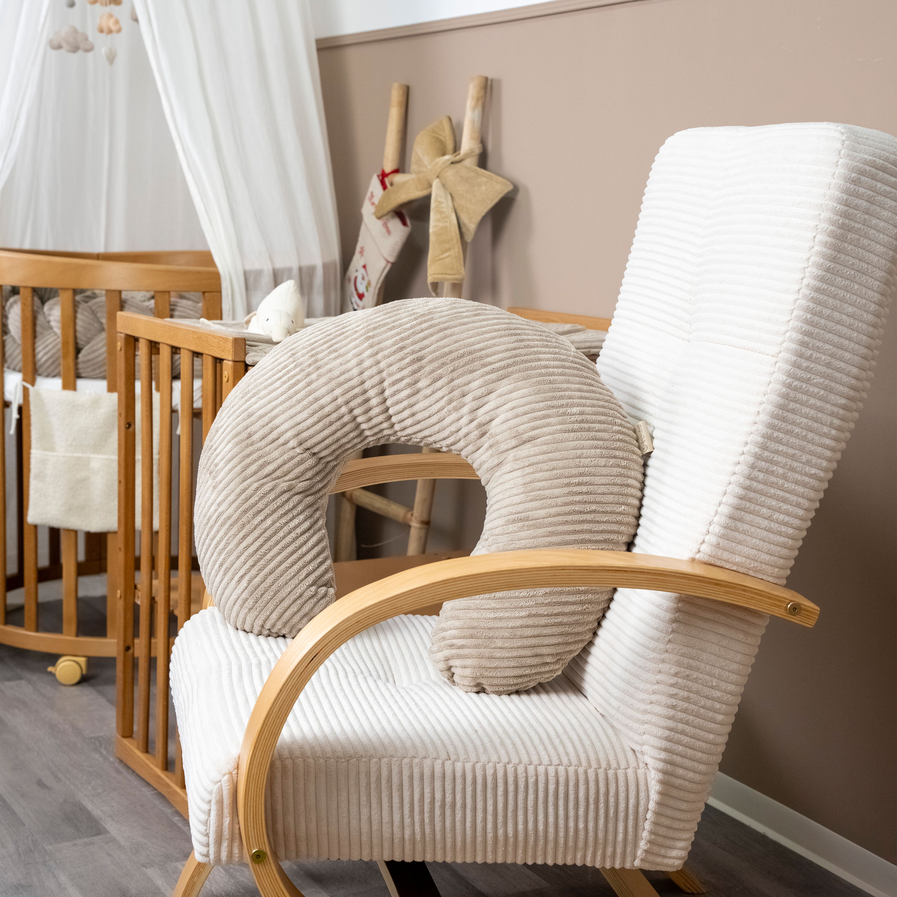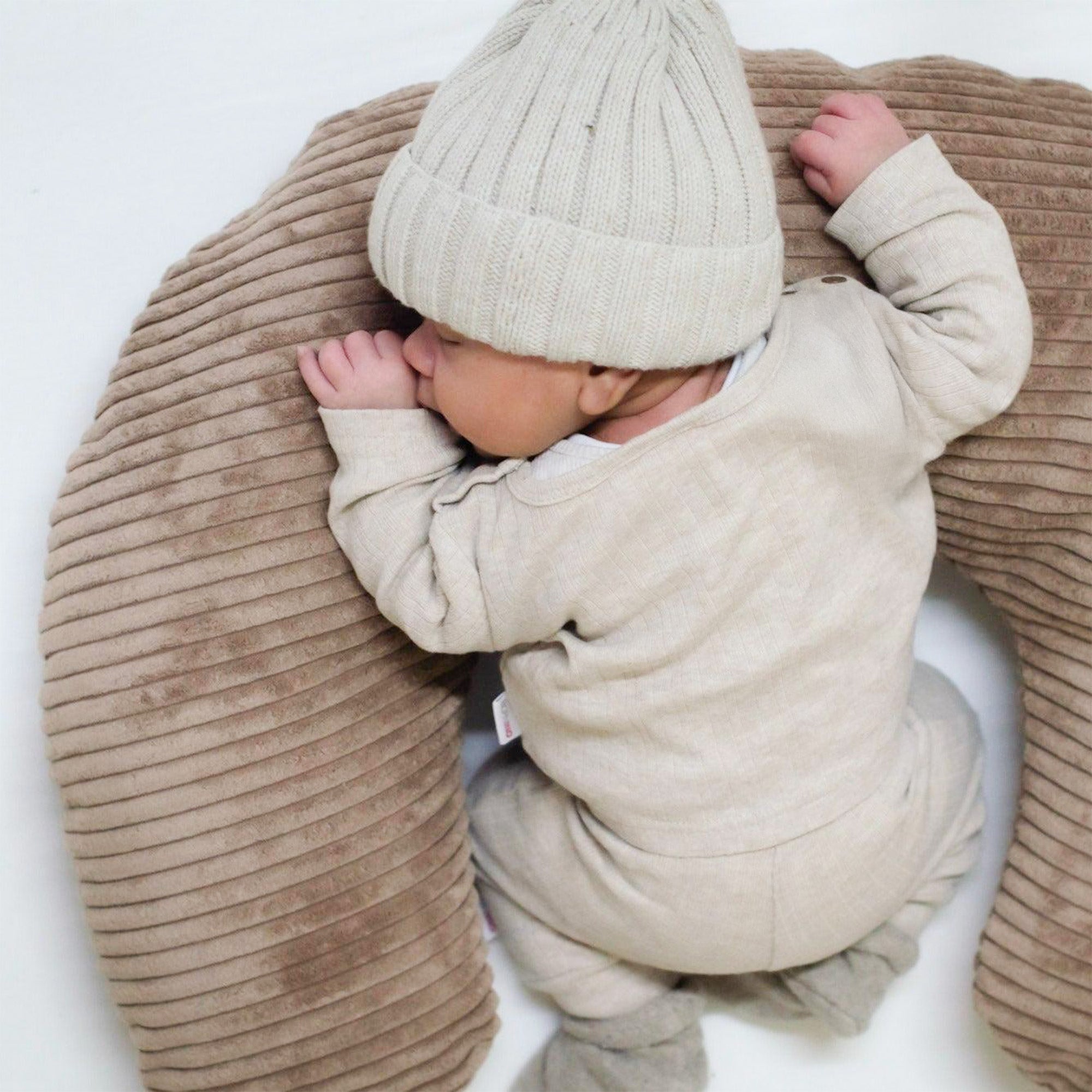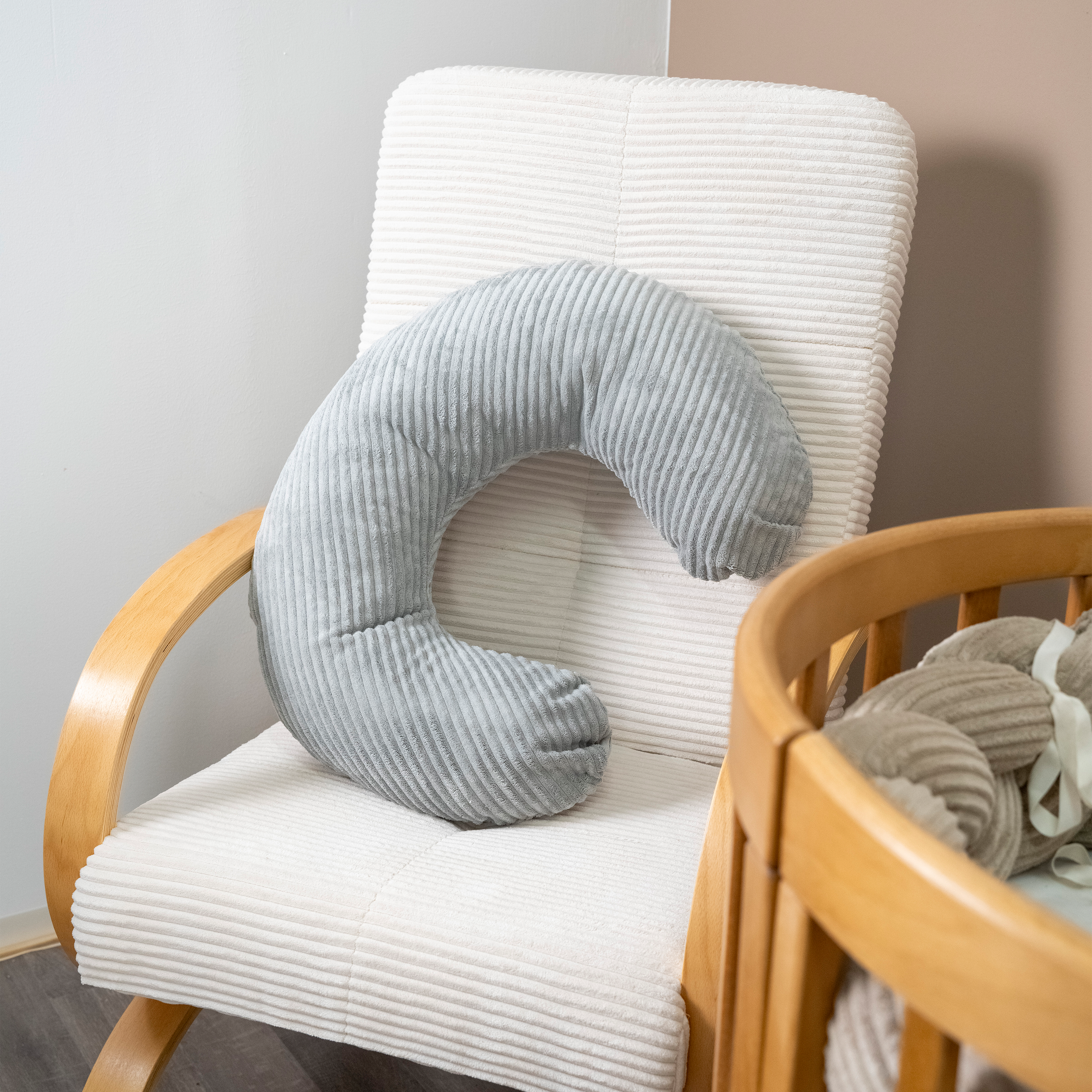Die Halbmond-Form passt sich optimal an Körper & Haltung an, während das kuschelig-weiche Cord-Material hautfreundlich und gleichzeitig stilvoll ist. Auch für dein Baby ist das Kissen vielseitig nutzbar: als Stütze beim Üben der Rückenlage oder beim Sitzen.