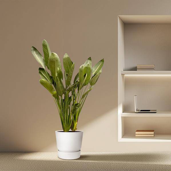 🌿 Exotischer Blickfang: Die Strelitzia Reginae, auch Paradiesvogelblume genannt, überzeugt mit kräftigen grünen Blättern und tropischem Charme.