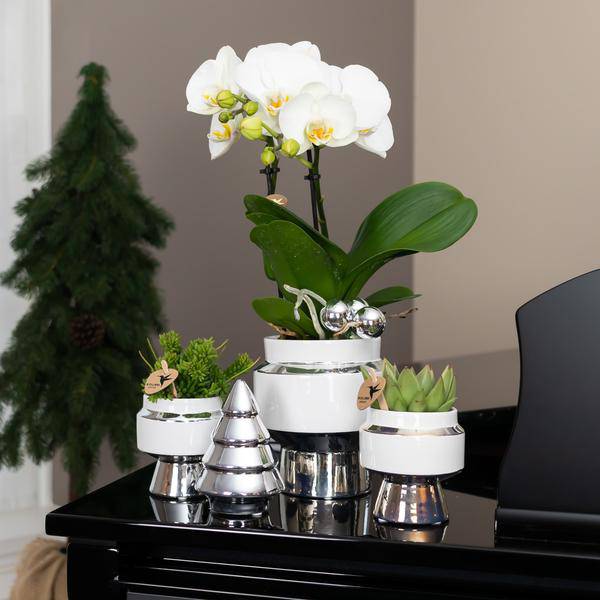 Geliefert wird sie im stilvollen Le Chic Keramiktopf in Silber mit 9cm Durchmesser. Der Topf glänzt durch seine elegante Oberfläche und passt perfekt in glamouröse, minimalistische oder moderne Wohnkonzepte.