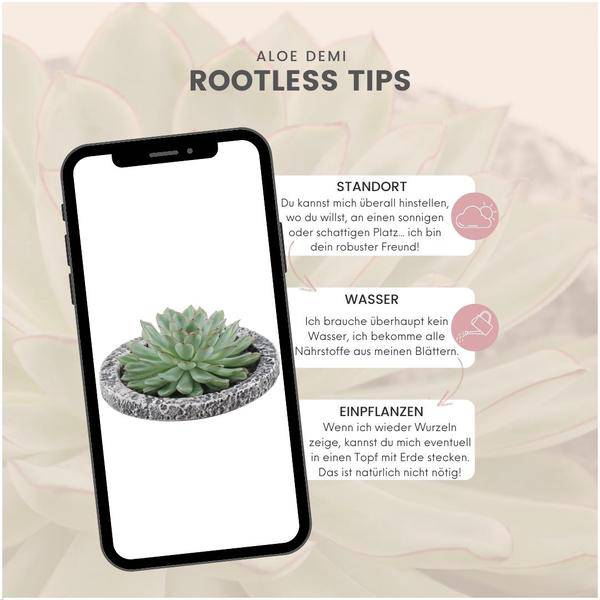ROOTLESS-Sukkulenten werden zunächst im Kulturtopf gezüchtet und später als Rosette geschnitten. Sie sind auch als Schnitt-Sukkulenten, Schnitt-Echeveria oder Schnittfettpflanzen bekannt und gelten als wahre Überlebenskünstler. Die Echeveria nutzt ihre unteren Blätter als Wasserspeicher und ist daher besonders robust.