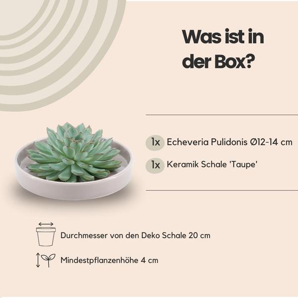 – Lieferumfang: 1× Echeveria Rosette (Ø12–14cm) + 1× Keramikschale Ø20cm in Taupe