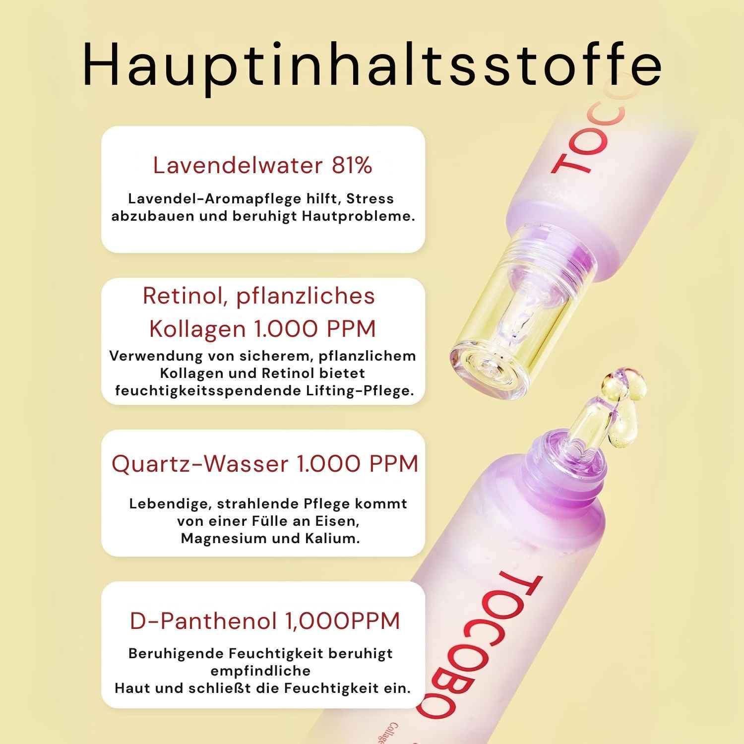 Indem du dich für die TOCOBO Collagen Brightening Eye Gel Cream entscheidest, wählst du eine hochwirksame Pflege aus der Welt der K-Beauty. Bietet TOCOBO eine Lösung, die nicht nur Feuchtigkeit spendet, sondern die Haut nachhaltig stärkt und schützt. Angereichert mit Lavandula Angustifolia Oil, Fructan, Glucose und Mineralien wie Quartz, wird die Haut rund um die Augen optimal unterstützt, gepflegt und sichtbar geglättet.