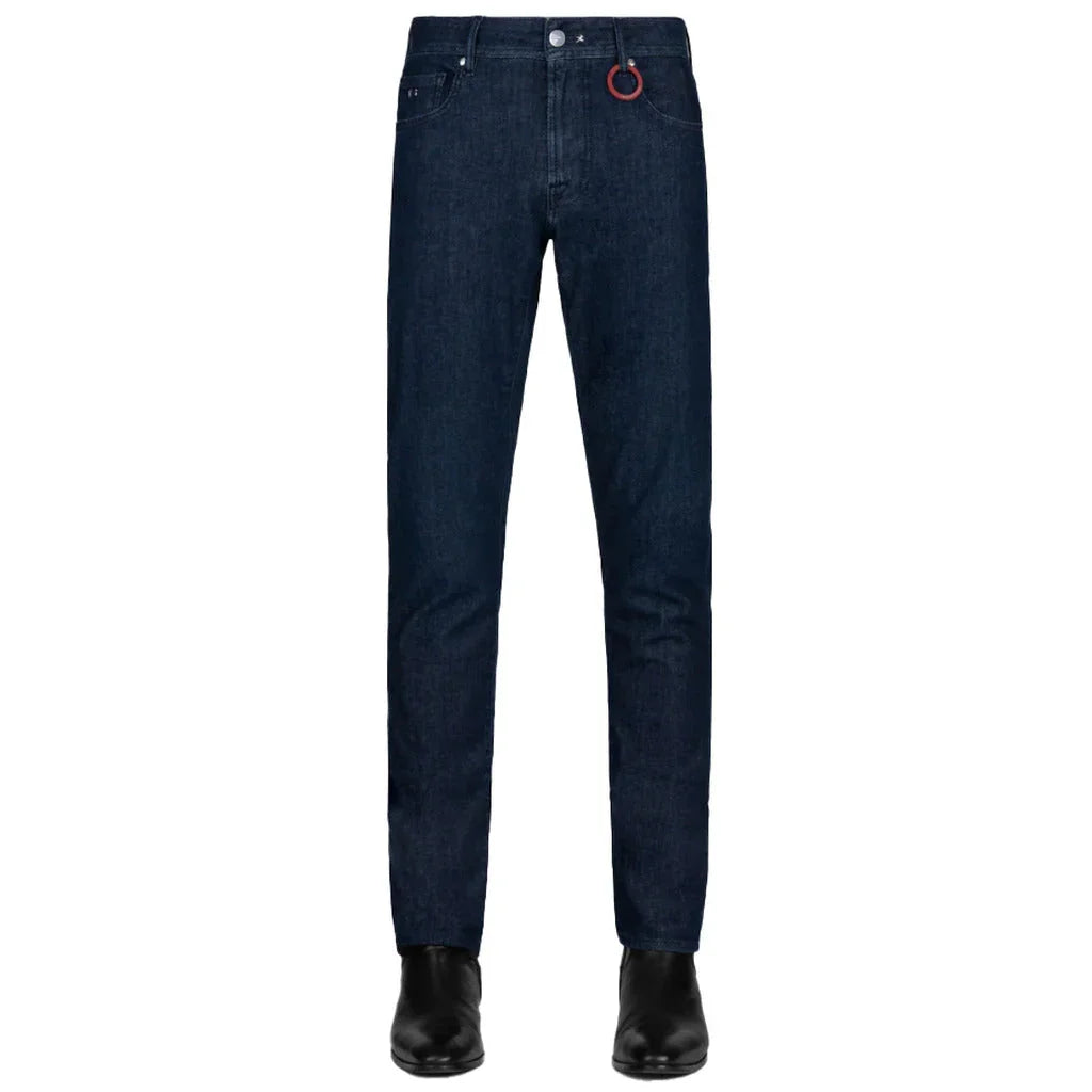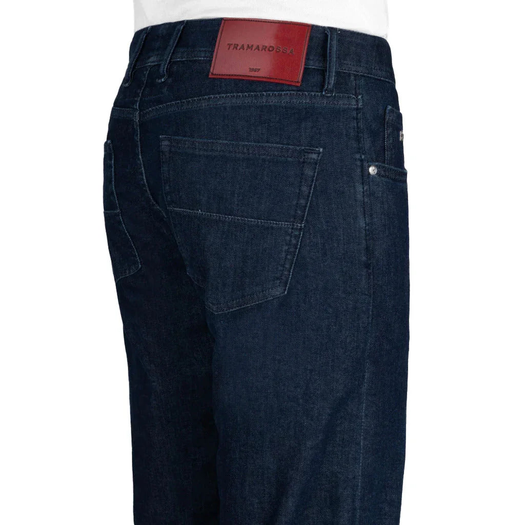 Tramarossa Michelangelo jeans in dark blue, super light, stretch cotton, zip and button fastening, five pockets, smooth red leather patch... Lesen Sie mehr