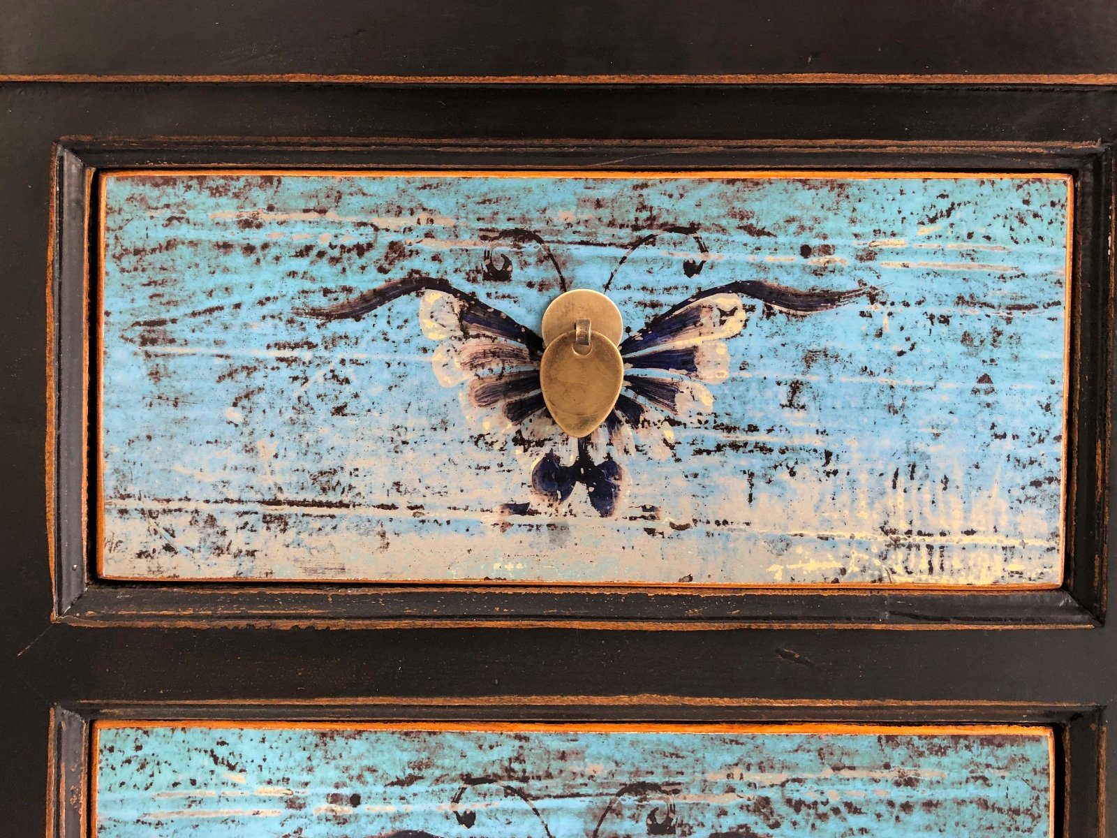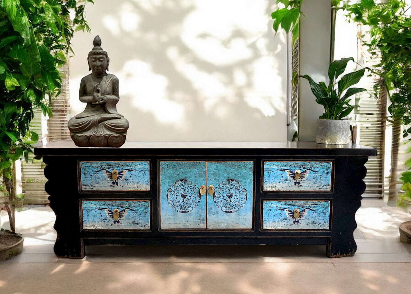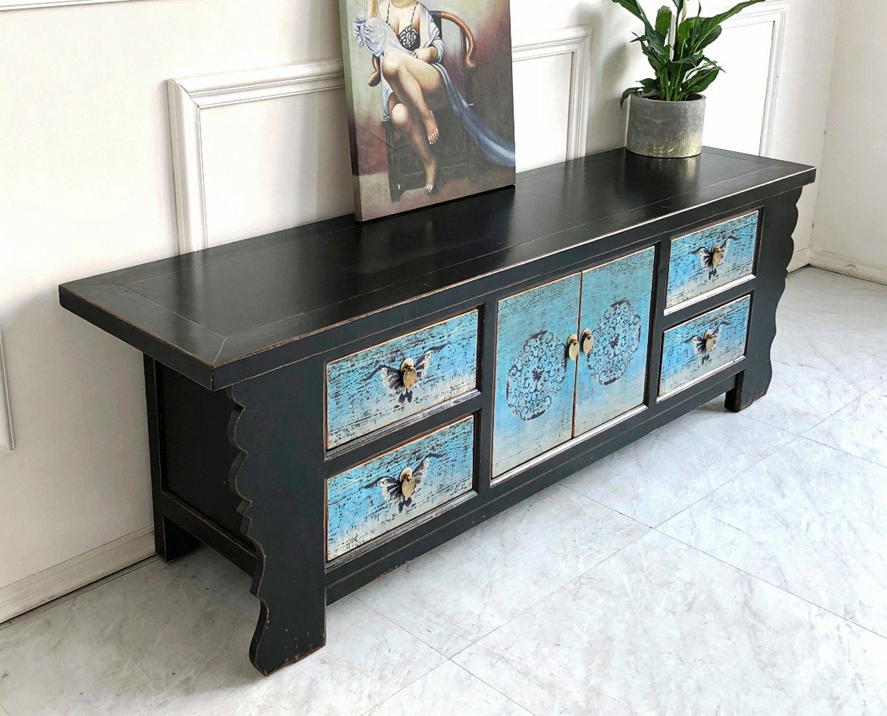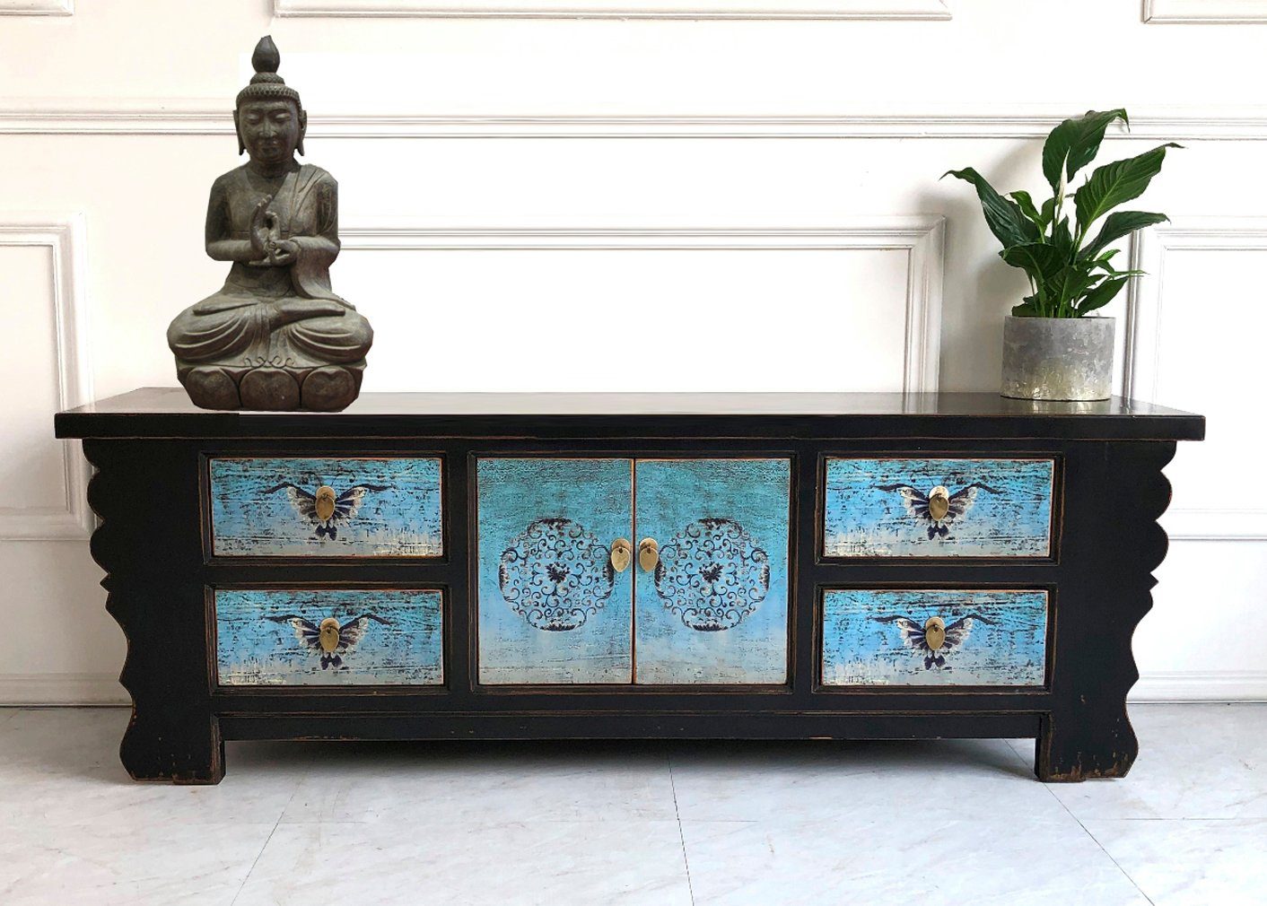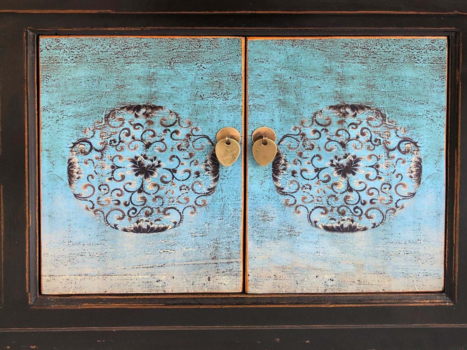 Schmuckvolles chinesisches Lowboard in exotischem Blau und Schwarz. Das Stück ist mit vier Schubladen und einem größeren Stauraum in der... Lesen Sie mehr